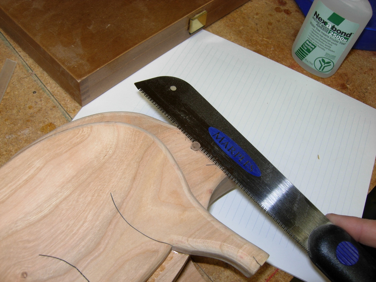 While Adam was finishing up his schoolwork today, I prepped his piggy bank for finishing. I decided to put walnut plugs in the eye and nose holes. I found a 1/4″ thick piece of scrap walnut and drilled a few plugs with my plug cutter.