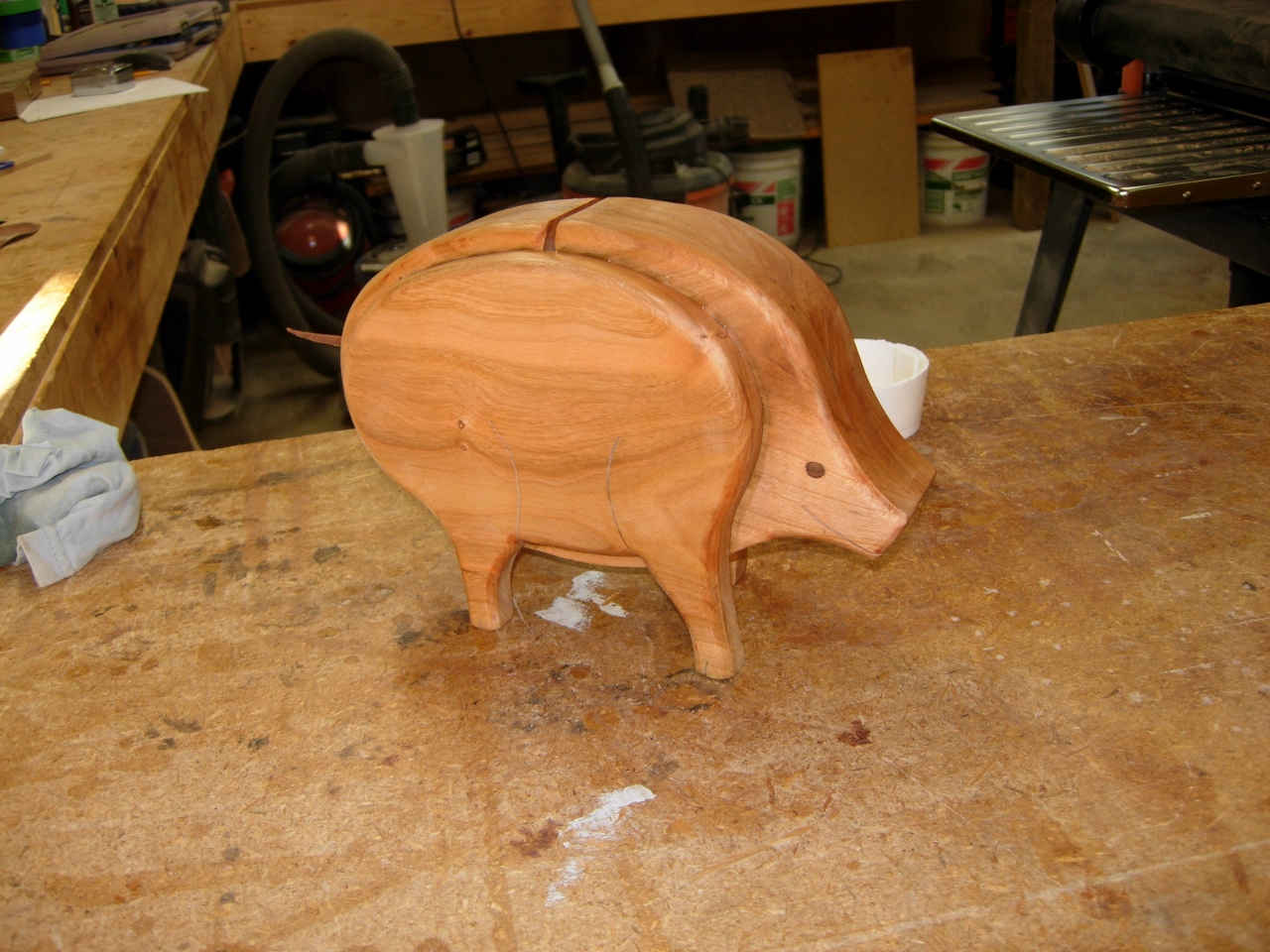 After Adam finished his school work, he came down and applied the first coat of Tung oil to the piggy. He did a pretty good job of it. We will let it cure this evening and apply another couple of coats over the next couple of days until it builds up a nice gloss.
