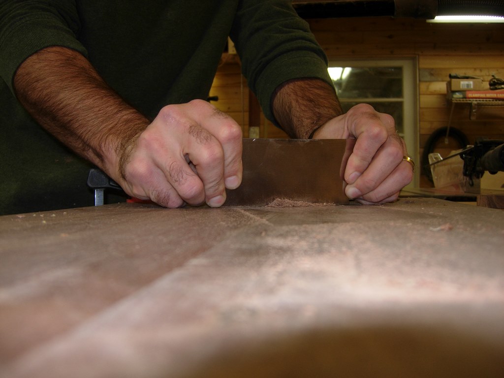 I pulled the clamps on the 14″ wide panel and removed the painter’s tape. There was a tiny bit of glue left to clean up, as well as a slight shift in the wood. I used a smoothing plane to clean up the joint and finished it up with a card scraper where the grain of the wood was being difficult.