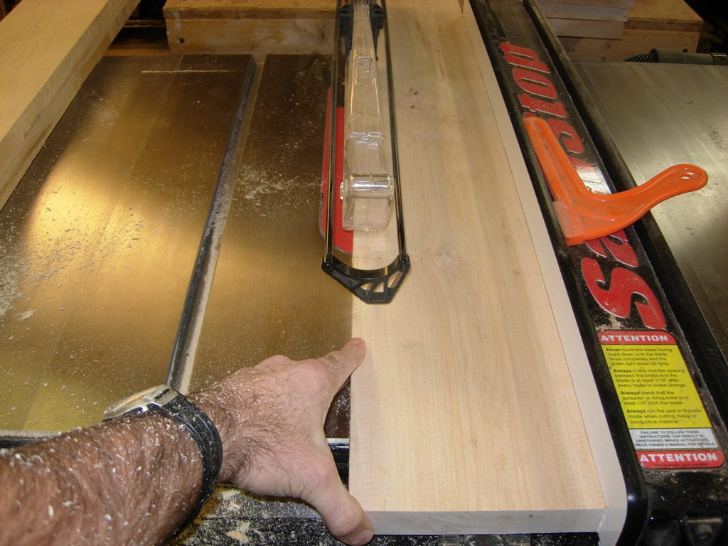 All of the maple boards, that I have, are 9′ to 10′ long, so the first step is to cut them all down to the approximate length required. I started with the large panels that will make up the bottom of the chests. I ripped three boards down to about 6″ wide for each panel. This will give me a panel that is a little too wide, but I can cut them down later.