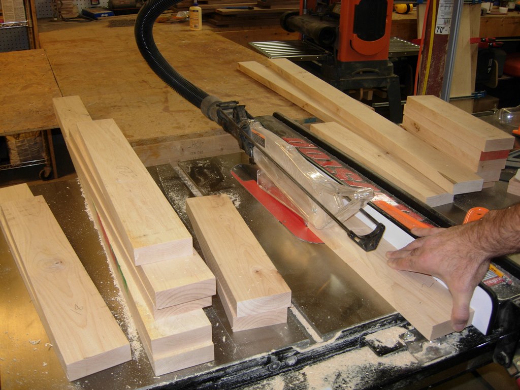 I started with the 3″ wide stock, cutting and ripping it down to the exact width and the approximate length. I will need to resaw and plane most of these boards down to 3/4″ to create the raised panels and the frame-work to hold them.