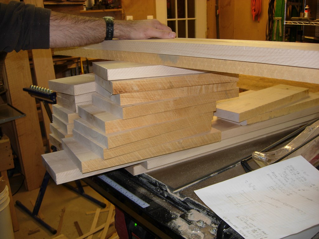 Working from my highly detailed sketch (above…) I proceeded to also cut the 4″ and 5″ parts to a rough length. After looking at the pile of stuff that I have to rip and resaw, I decided to call it a night. Hopefully I will be able to get that done today, and glue up the rest of the panels.