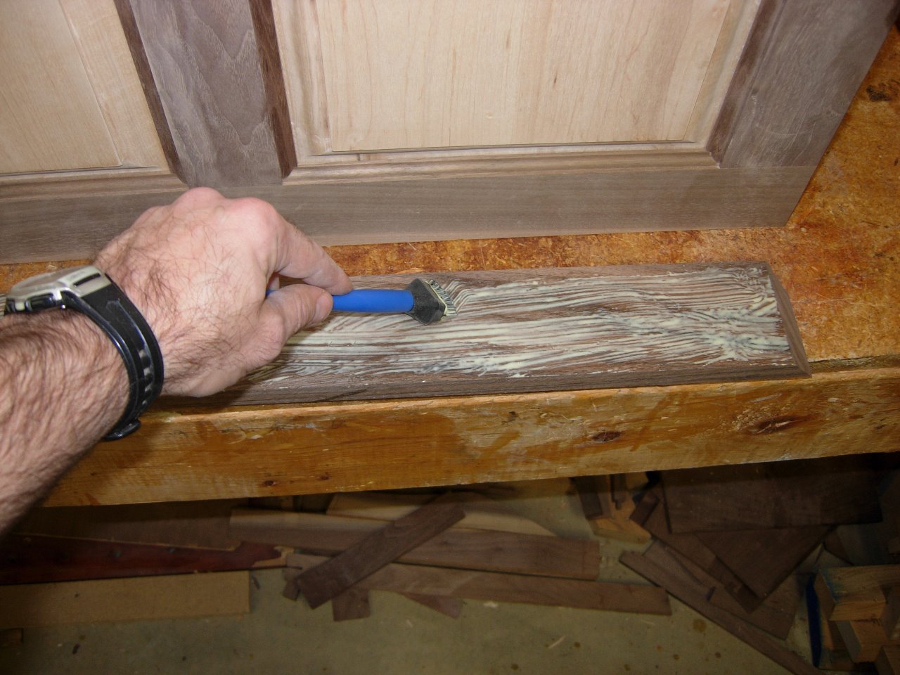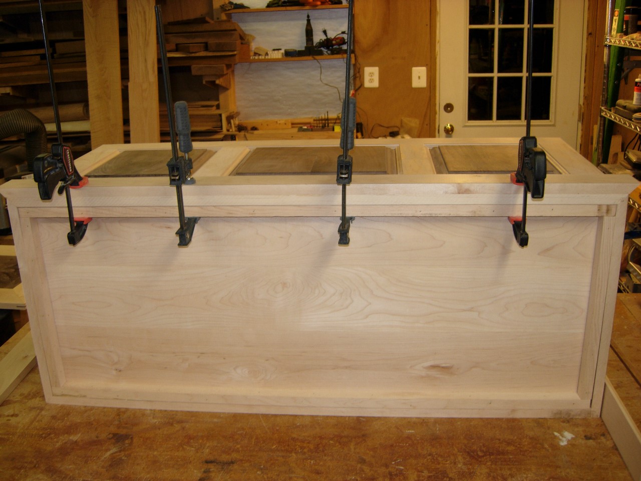 My goal was to not nail the face of the trim. That means I needed a lot of clamps at every location possible. I decided to toe-nail the trim on from the bottom, angled back towards the middle of the chest. This is just a little back-up measure, in case the glue ever fails. It will insure that the trim stays in place. I set the nail heads down below the surface so the nails won’t snag the carpet or scratch the floor.