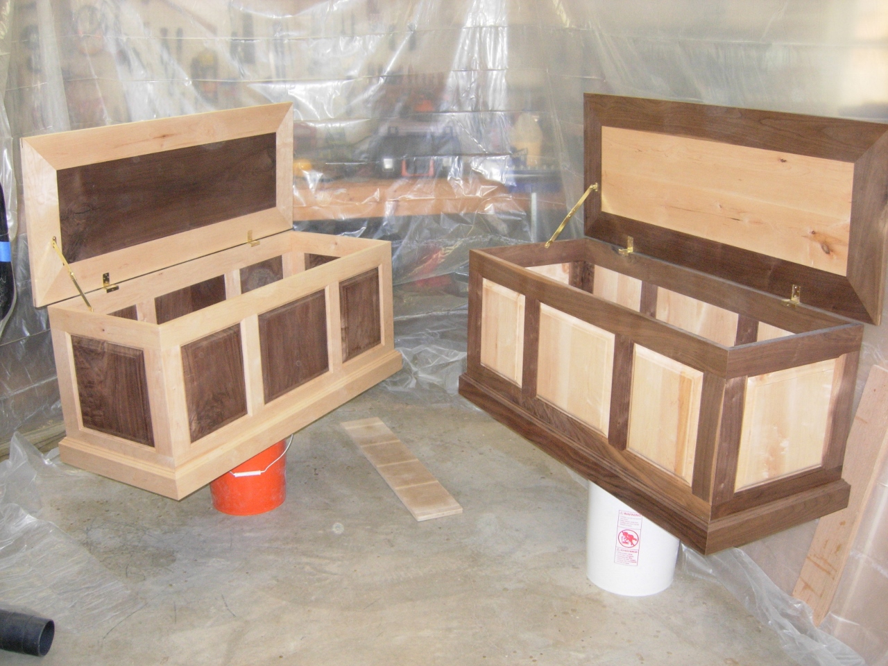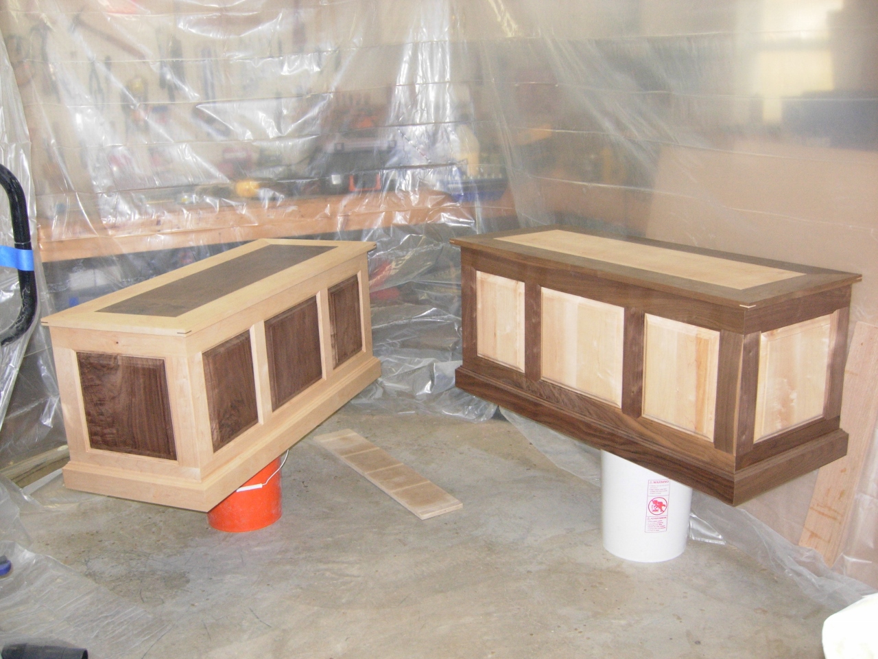I got up bright and early this morning to get the last coat on the chests. I gave the surface a quick once-over with some fine sand paper and sprayed the boxes with their final coat. Two hours later, I went back down and put the final coat on the back side of the lids as well. When they were all dry, around noon, I loaded them up and delivered them to the parish center where the silent auction will be held. I also dropped off the carvings that I did a couple of weeks ago, as well.