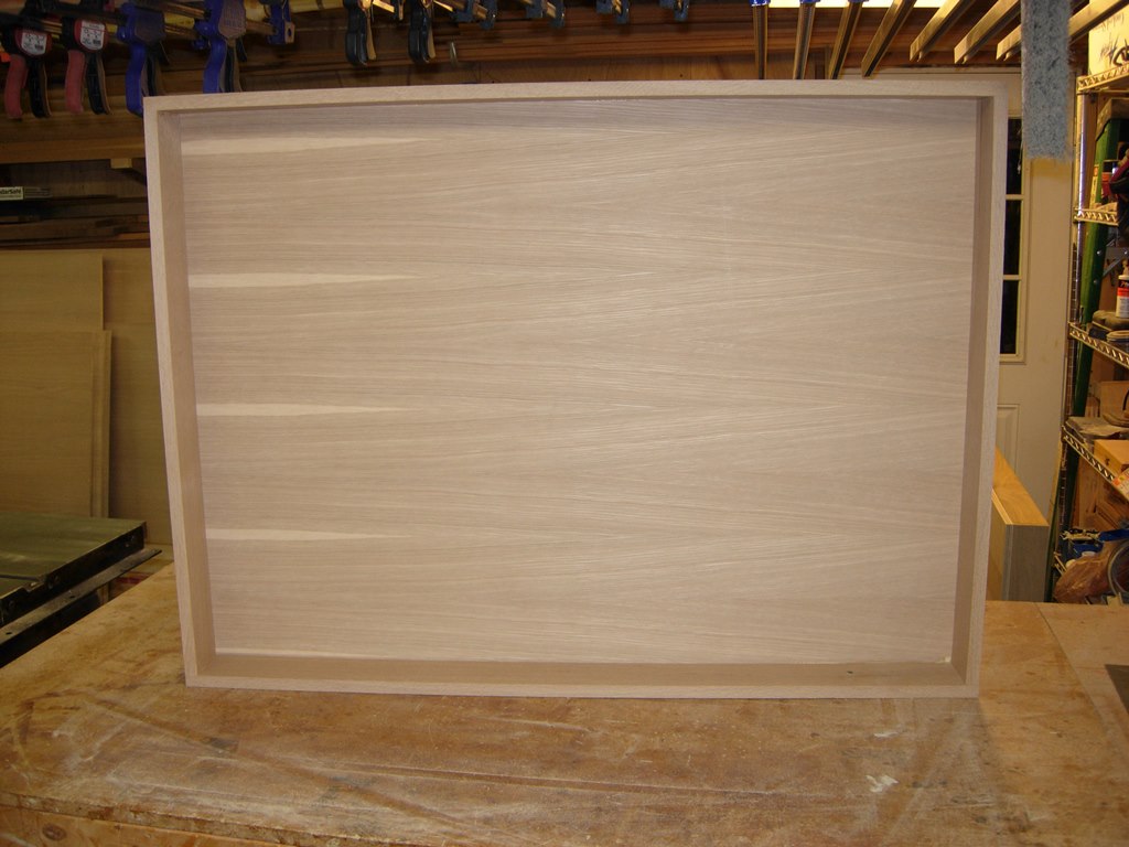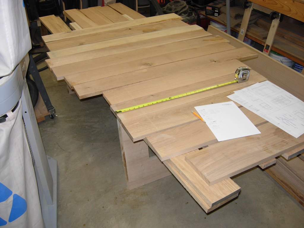 I am finally done dragging my feet on starting this project. I actually started it a few weeks back (breaking down plywood) but I have had other things to do, and I was waiting on the oak. I picked up the oak last week, and refined my drawings, so I am ready to get started in earnest. This cabinet will be massive, 4′ wide x 3′ deep x 7′-6″ tall. Constructed with 3/4″ white oak plywood and 3/4″ white oak trim, and have five adjustable shelves inside.