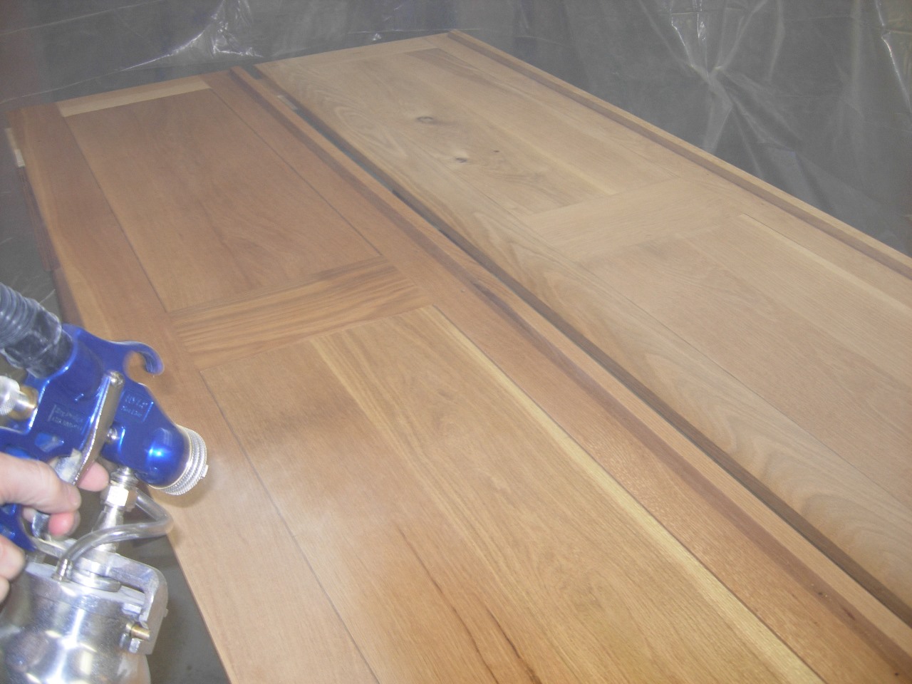 The door seems to be getting more of a textured finish. I believe the problem is that I need to use the smaller needle in my sprayer. This will atomize the spray further making the mist finer. I believe the mist in the air is landing on the doors after my spraying is complete. This would explain why it is only happening to the doors which are laying flat. For the third coat on the doors, I applied a brush coat instead. That gave me the final finish that I was looking for.