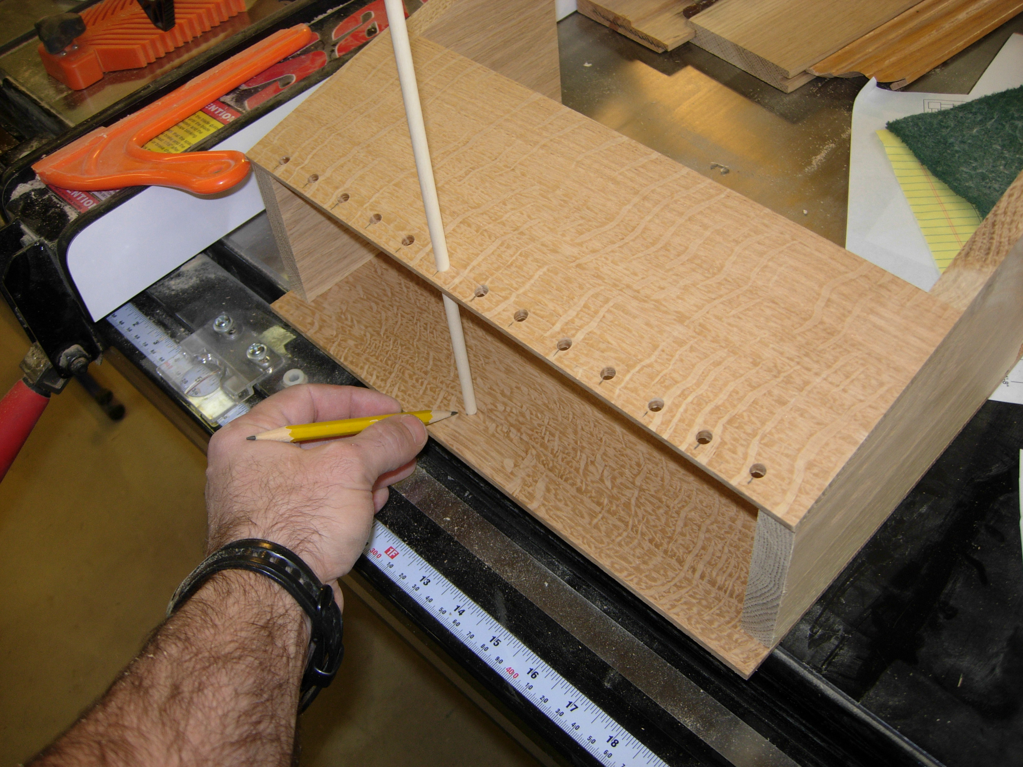 I set the sides on the back panel, leaving 1/2″ on the top and bottom for mounting holes, then placed the front panel on and dropped a dowel through to the back panel, to locate where the rear holes needed to be. It turned out to be almost exactly 1″ up from the bottom. I proceeded to lay out the holes every inch along the bottom, and drilled them with the board laying flat.