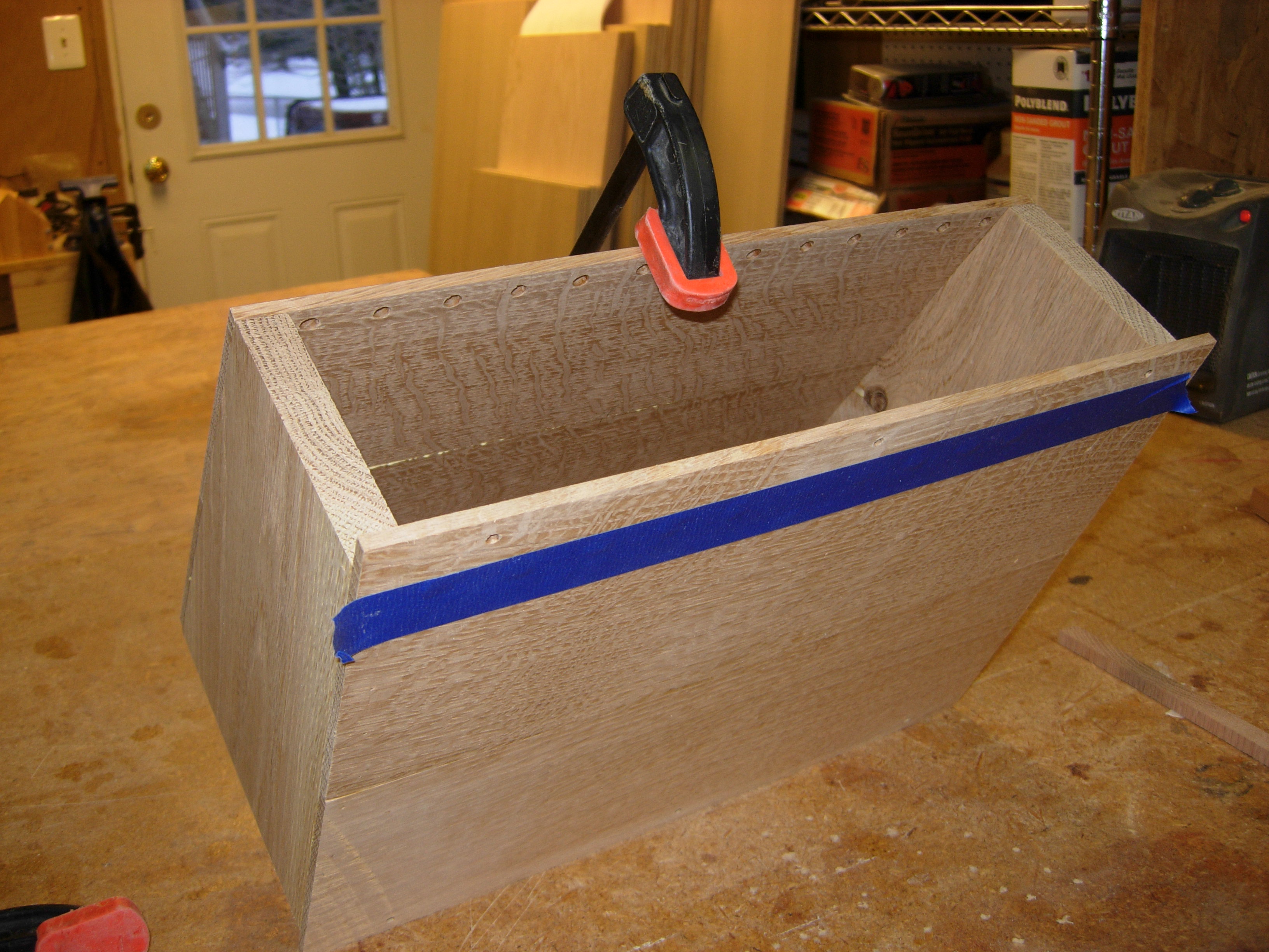 I applied glue to the back edges of the sides, and also to the edges of the rear panel that met in the middle. I located and attached the rear panel with 23 gauge pin nails, to hold everything in place while the glue dried. I clamped the top and bottom panels together as well while they dried.