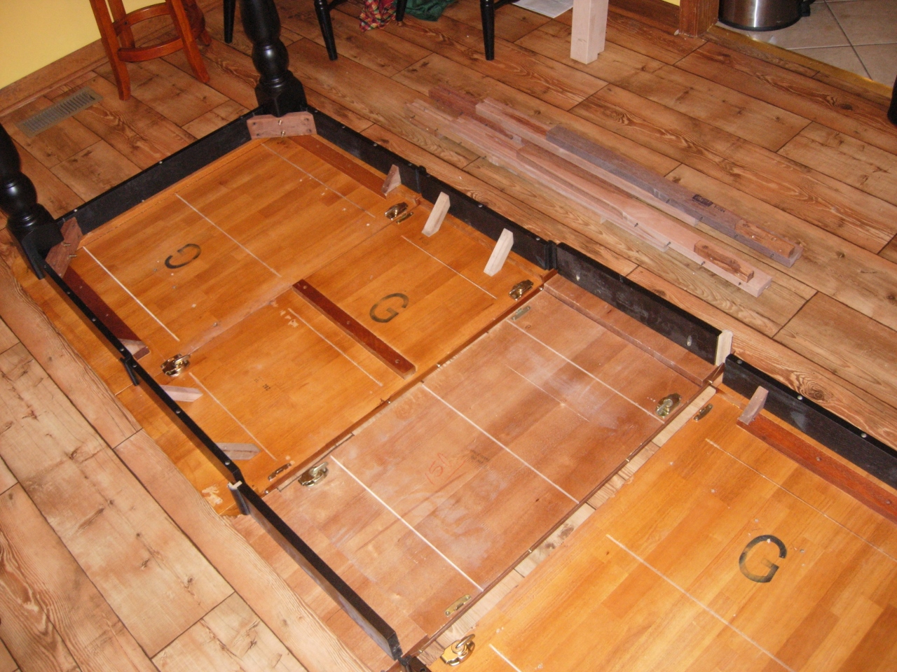 I finally got a time slot to install the rails for the extended dining room table. Things didn’t go as smoothly as they could have, but a little challenge is good for you. First hitch was the new table leaf. It was apparently from the same manufacturer as the table, but not for the same style table. The overall width, length, and thickness was the same, but the skirt pieces were too tall and in the wrong location. The pins and latches were also in the wrong location. I drilled new holes to locate the pins, and relocated the skirt pieces, but I was not equipped to cut down and repaint the skirts. The owner is fine with that, if they become a problem, they can always be modified later.