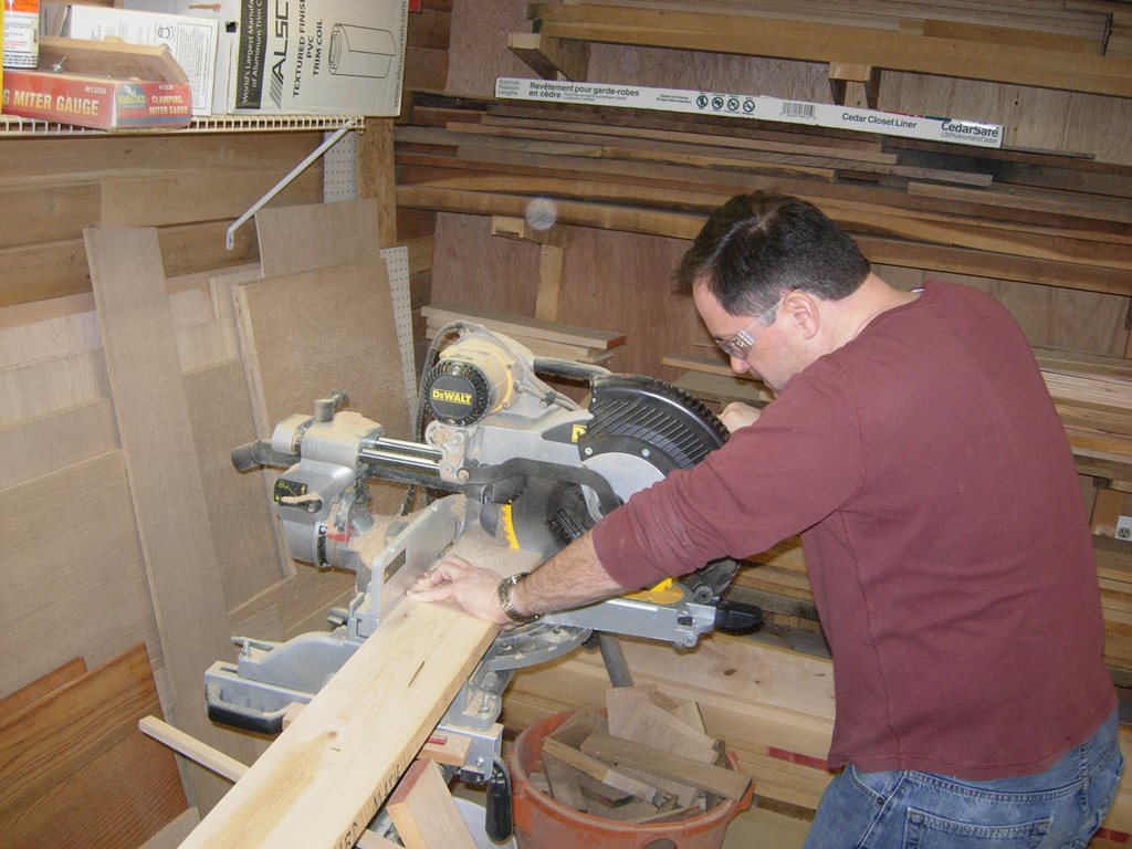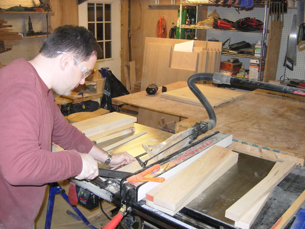 We are making the skirt pieces 3″ wide, so rob ripped down four of them for each table.