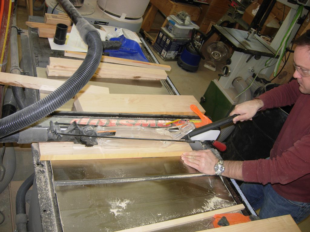 The legs will be 2″ x 2″, so we are going to glue together two 1″ thick strips. So we can easily plane the legs smooth, we rip the leg pieces 1/8″ wider. This gives us plenty of wood to plane away later, to clean up the glue joints.