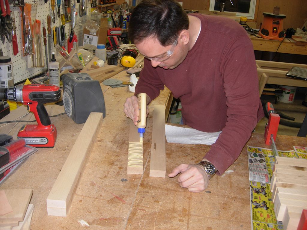 I set the planer to remove an additional 1/32″ of wood, just to smooth one face. Rob ran the 16 leg halves through, then applied glue, liberally, to one half. We sandwiched the two planed faces together, and set them aside to be clamped. The process was then repeated seven more times.