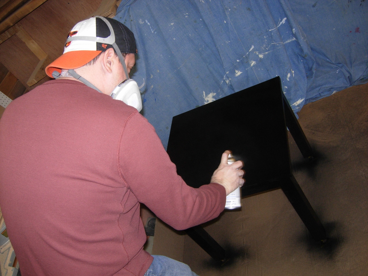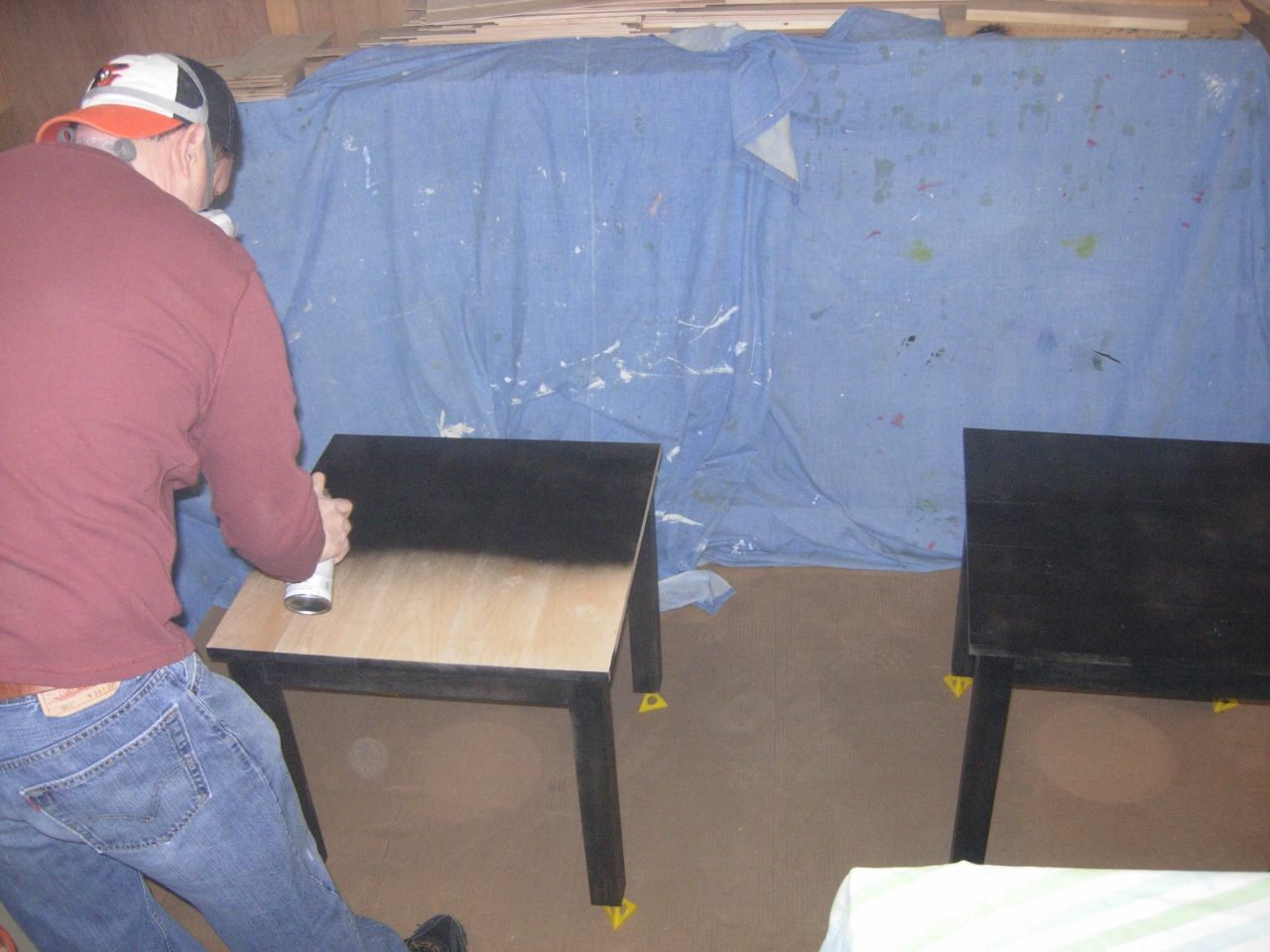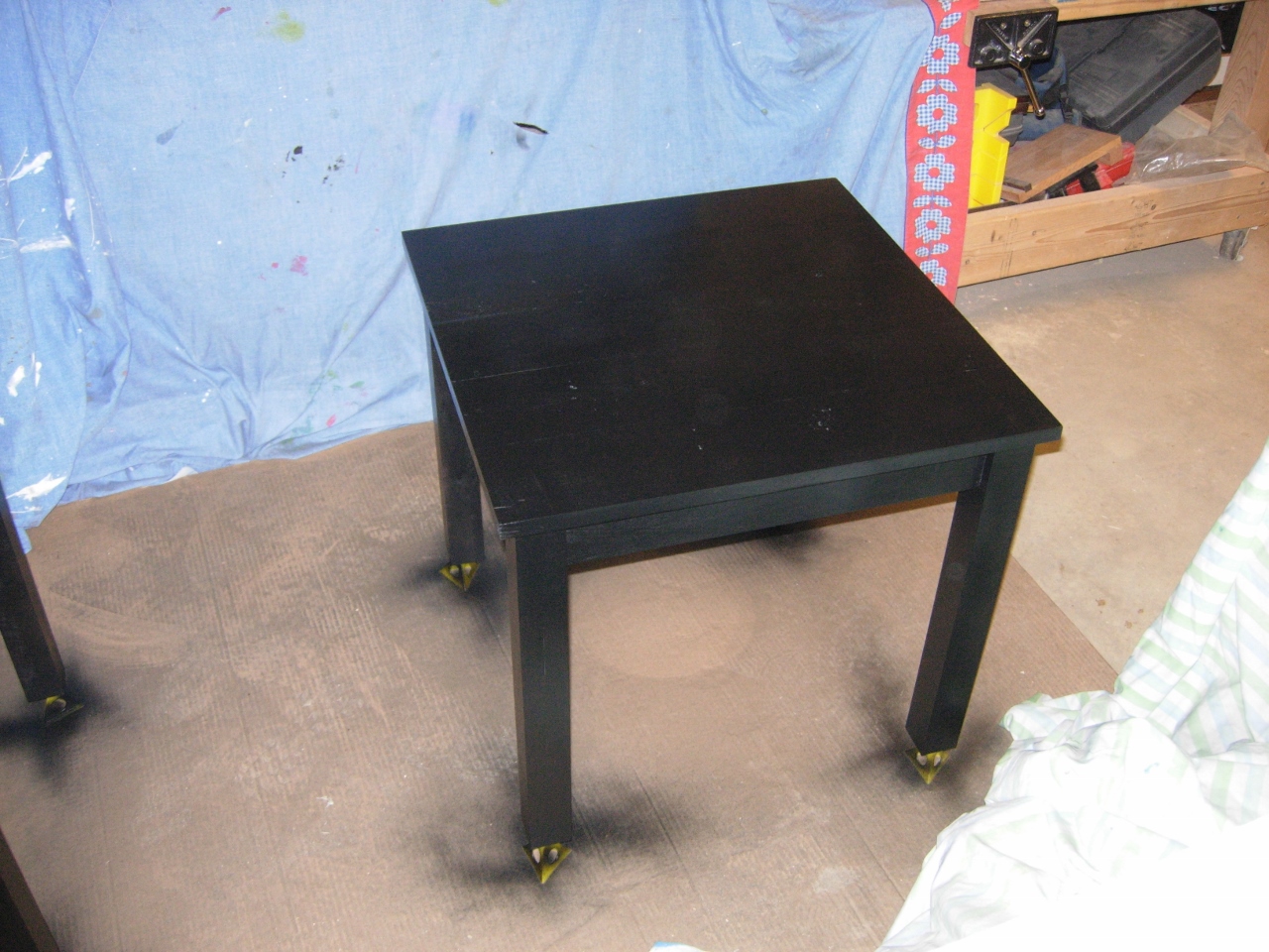 Rob went out yesterday and picked up a couple of cans of spray paint to finish up these end tables. Since I am building some cabinets on the other side of the shop, my make-shift spray booth was a large piece of cardboard and three bed sheets. It kept the over-spray off of everything, but the fumes still managed to creep through the house.
