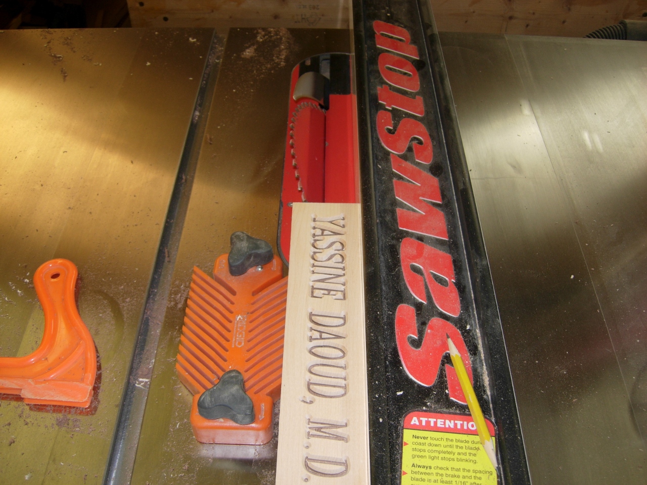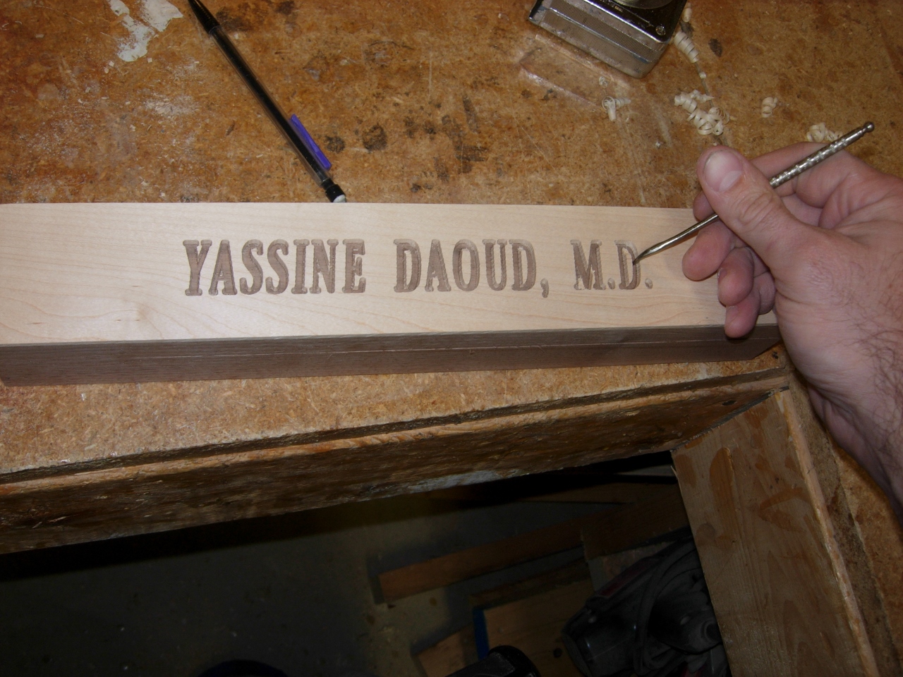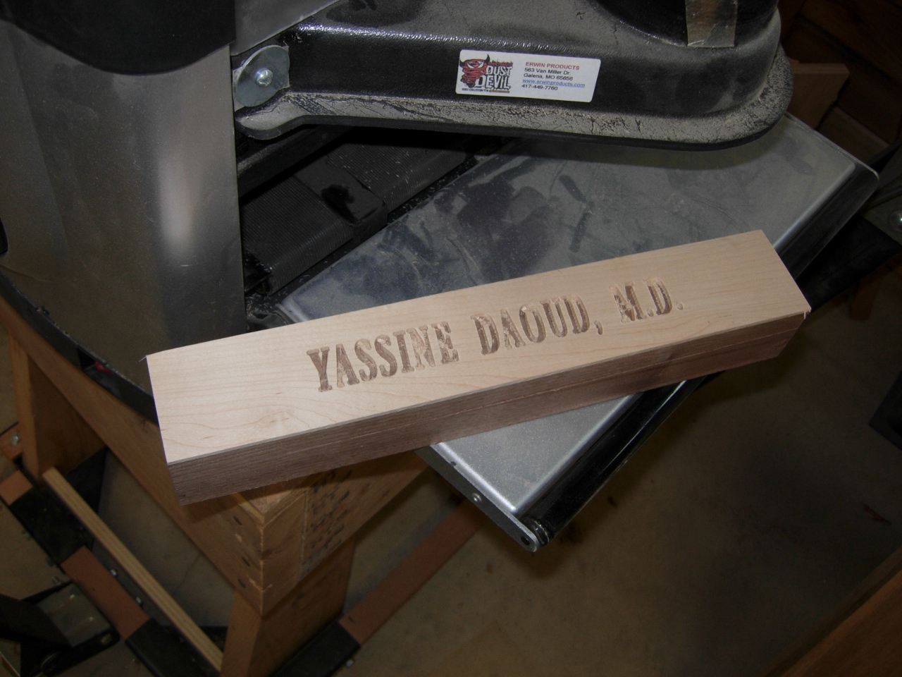 My mother has a lot of trouble with her eyes. Lately she has found a really good eye doctor that she just loves. She wanted to have something made for him, so she asked me to make him a name plate, on my CNC router, for his desk. After thinking about it for a bit, and routing through my scrap pile, I decided to make the main body out of walnut, but Veneer a thick layer of maple on it, then cut the name through the veneer to highlight the letters.