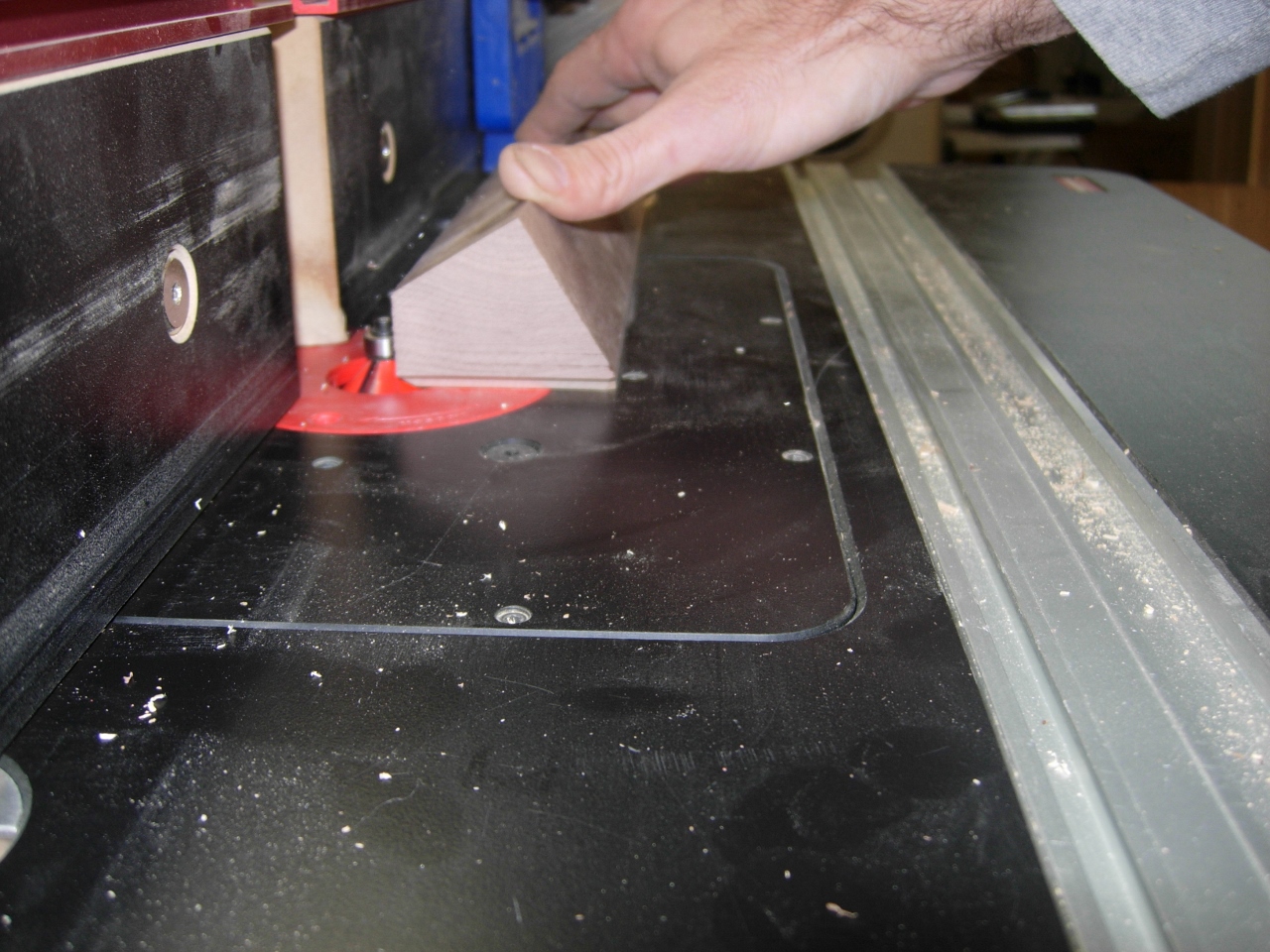 I rotated the block to sit on the angled surface and angled the back as well. Next I placed a 45 degree chamfer bit in my router table and beveled the edges around the face.