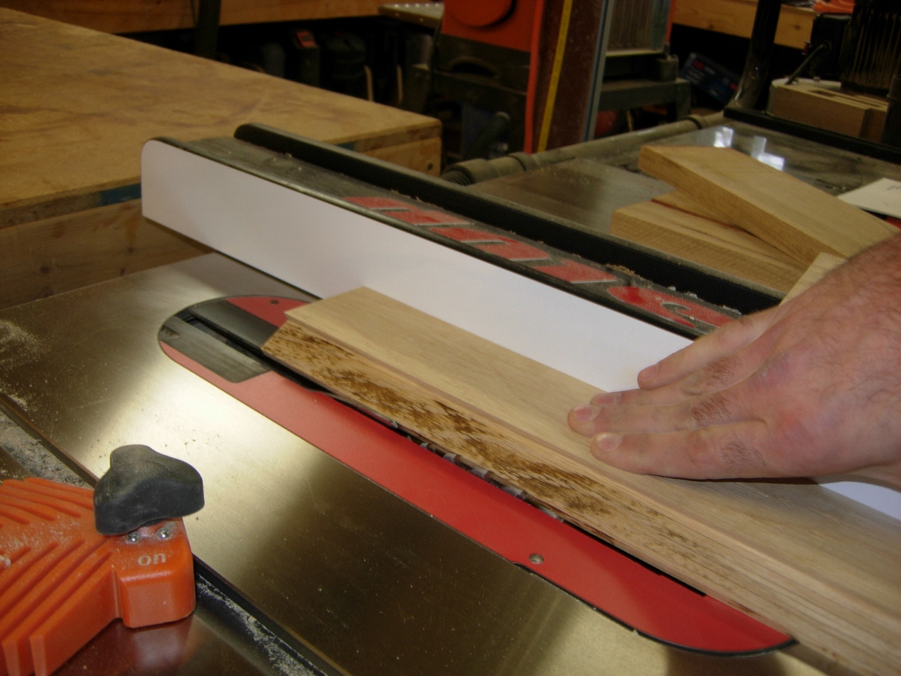 To do the next seven barrel staves, I select pieces that are completely straight. I rough cut them to 15″ in length and take them to the table saw.