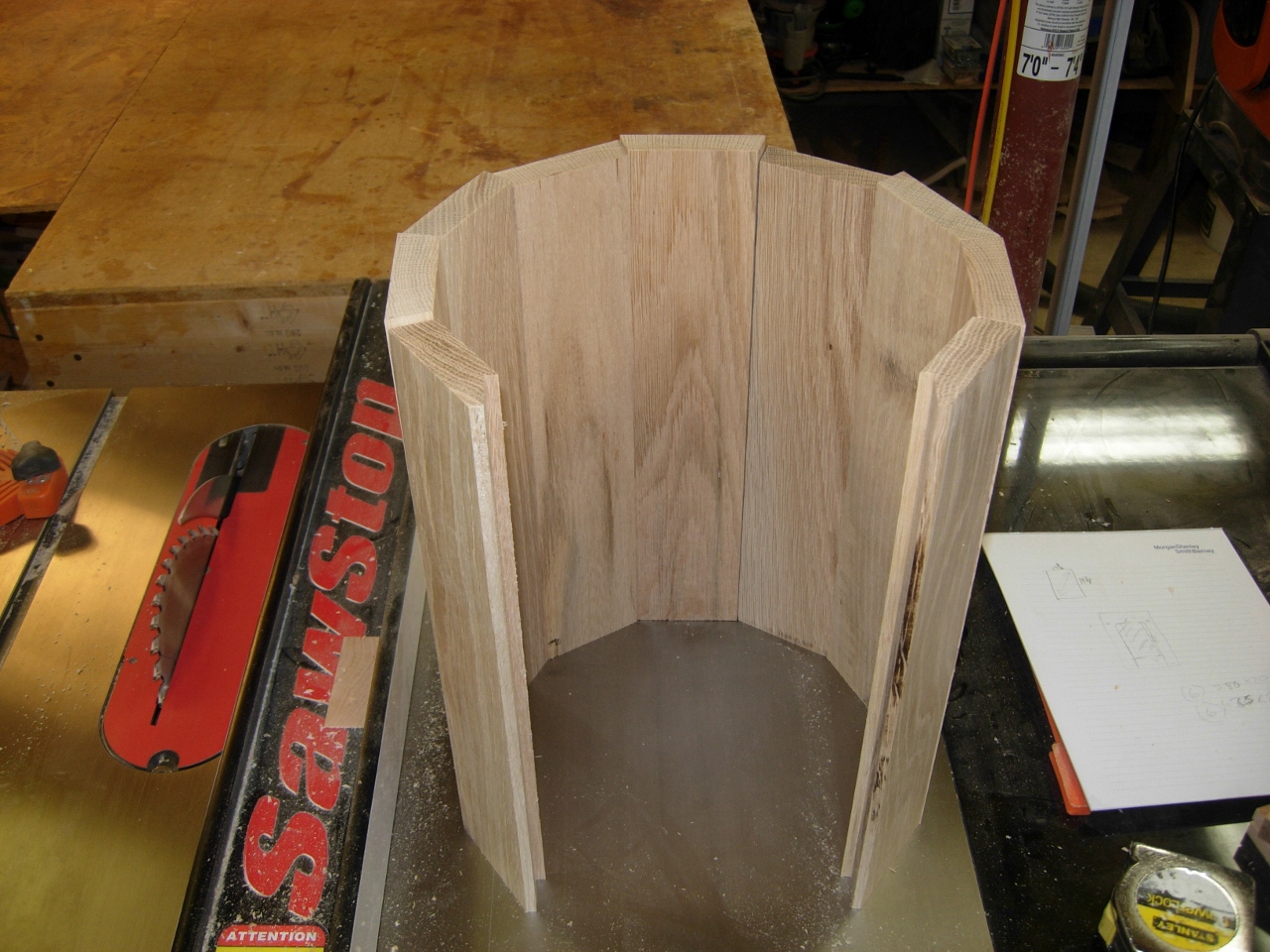 These are the plans that I am working from, to start. The main body will be constructed like a barrel with angled staves. I will be leaving out three of the staves to insert a flat door. That should make turning the column more challenging. Since it will be difficult cutting the door opening out after assembly, I am cutting the required notches out first. I calculated the opening on the computer, so I know the angles, but I cut out full size pieces to make sure I am cutting everything right.