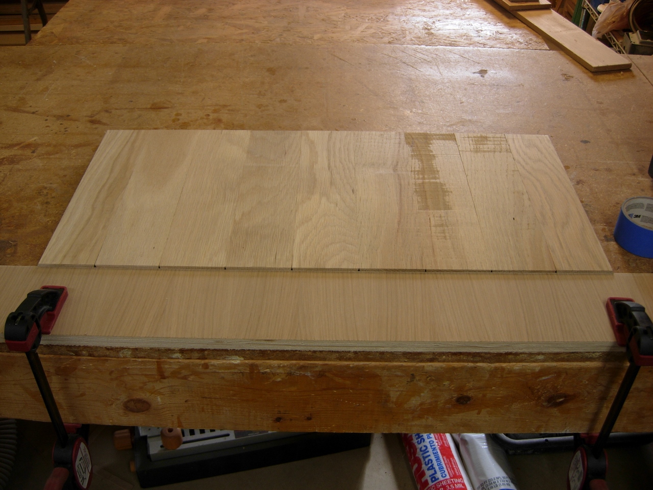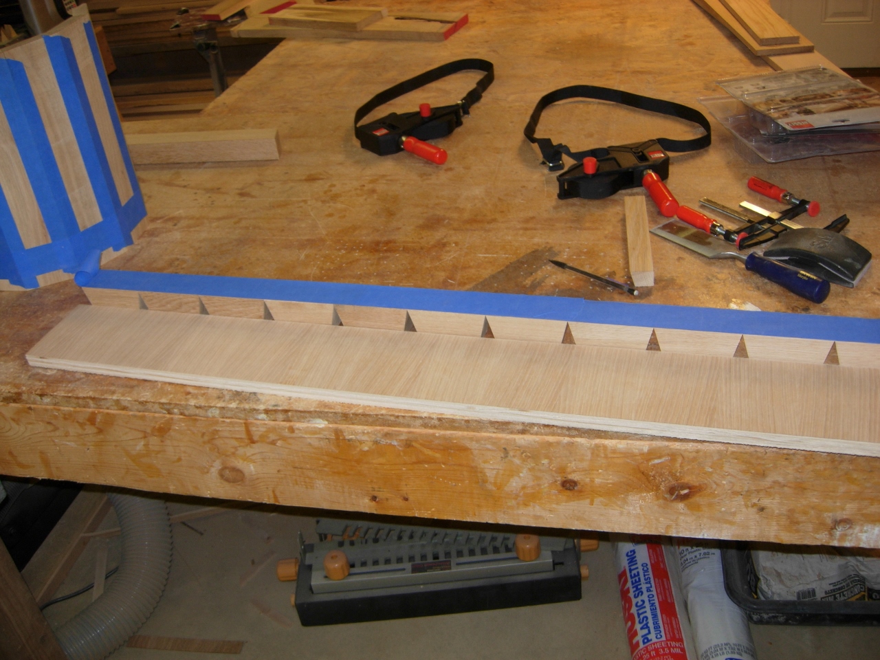After chopping each stave to 14-1/4″ long, I laid them all face down on my bench and lined them up on a straight edge.