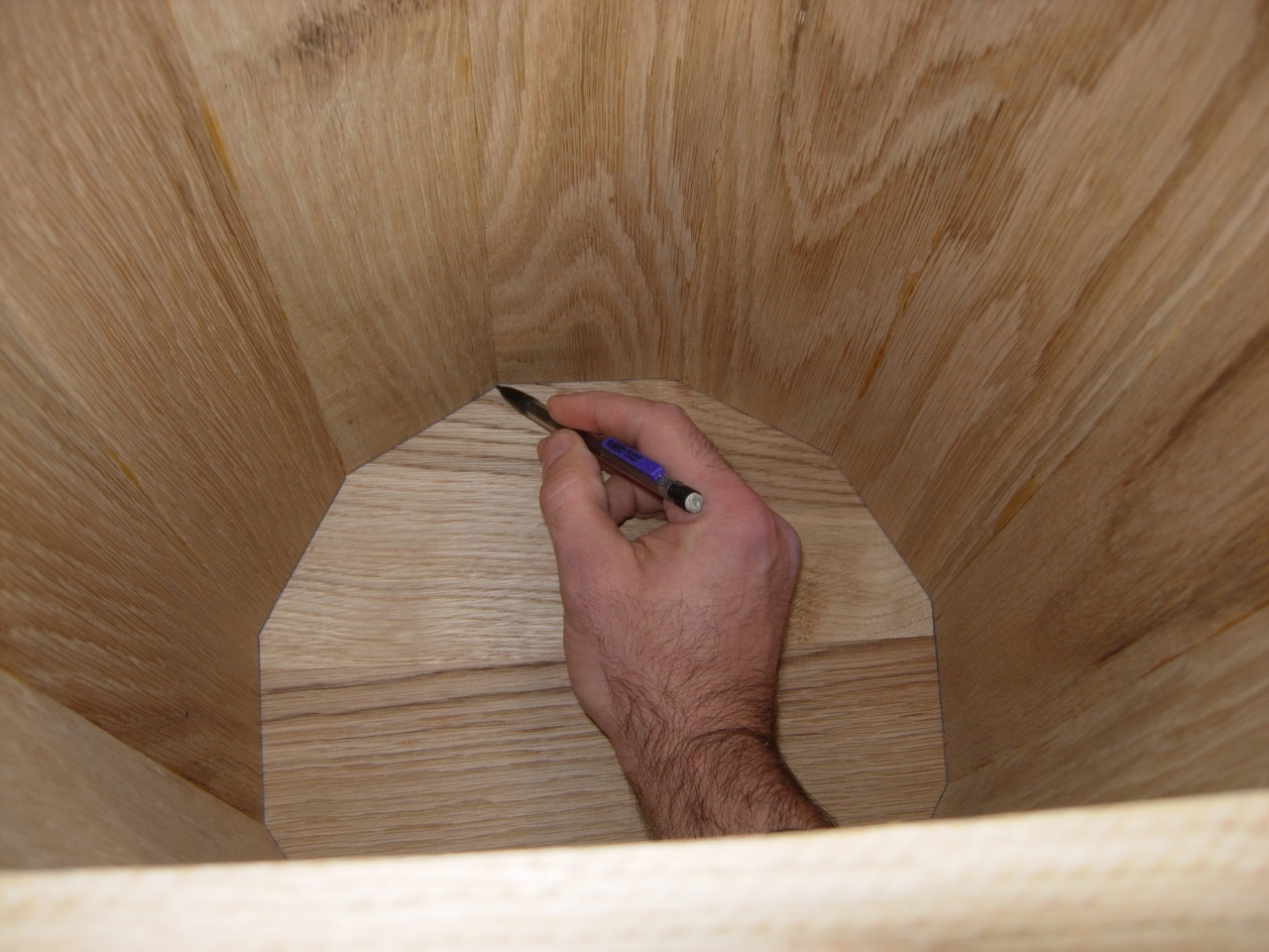 While that was drying, I made a small plate for the bottom. When it was dry, I planed it down and traced the bottom on it.
