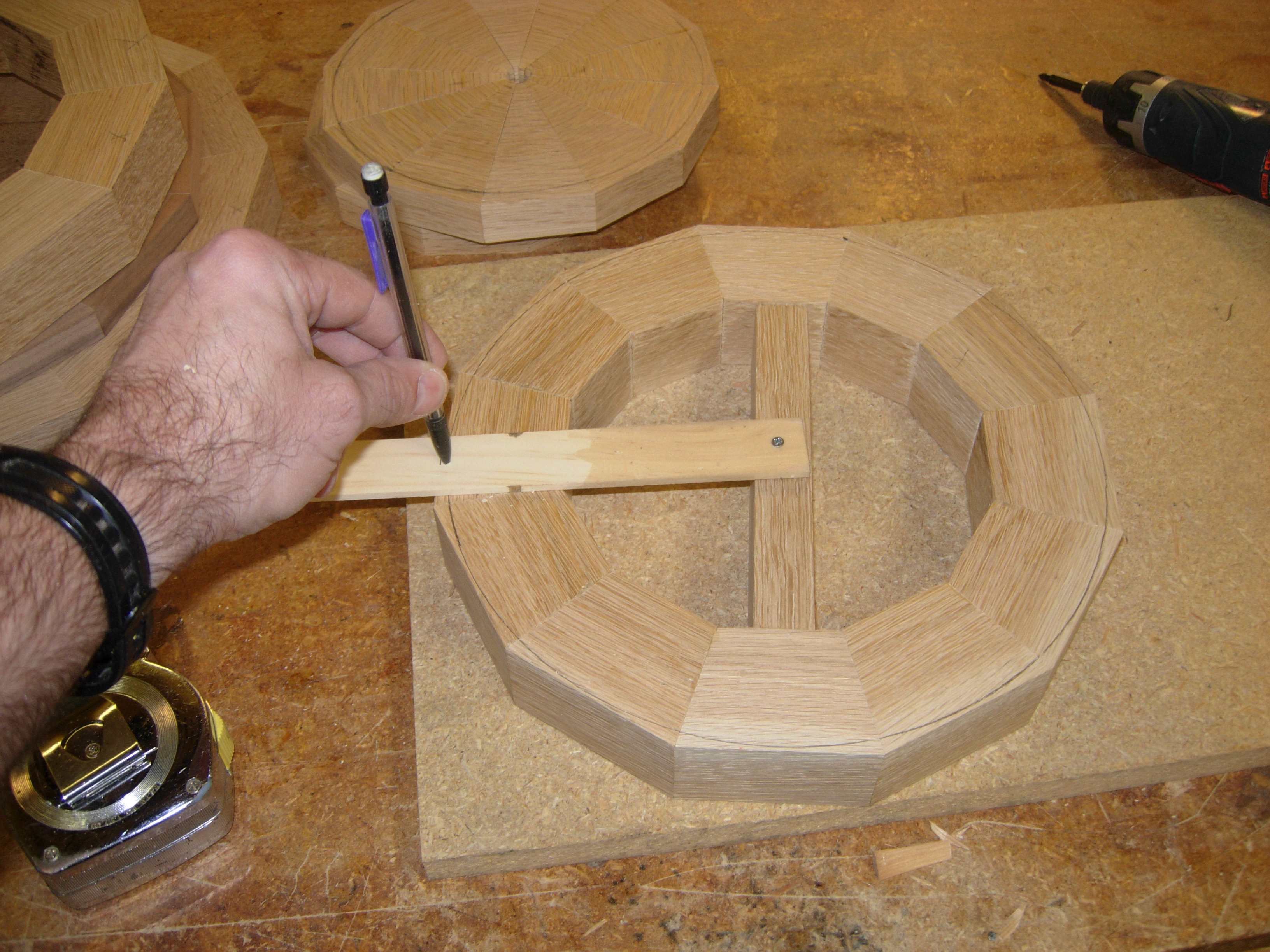 With all the faceted layers glued up, it is time to assemble them. To make life a bit easier, when turning the outside of the dome, I marked my required radius on each layer to be cut into a circle. The larger solid layer had a rough hole on the center so I cut a plug out of fir and pressed it into the center to hold my compass point.