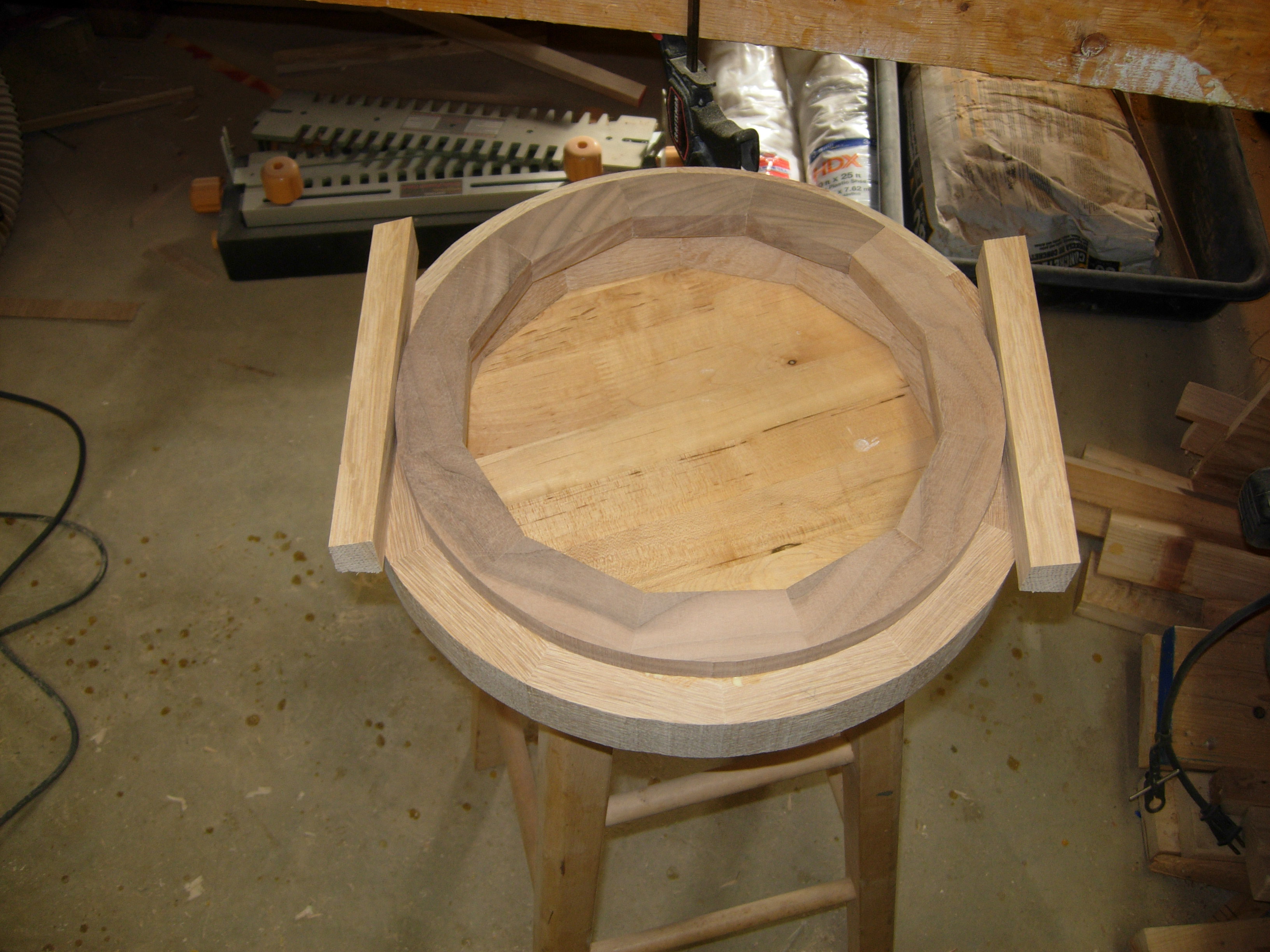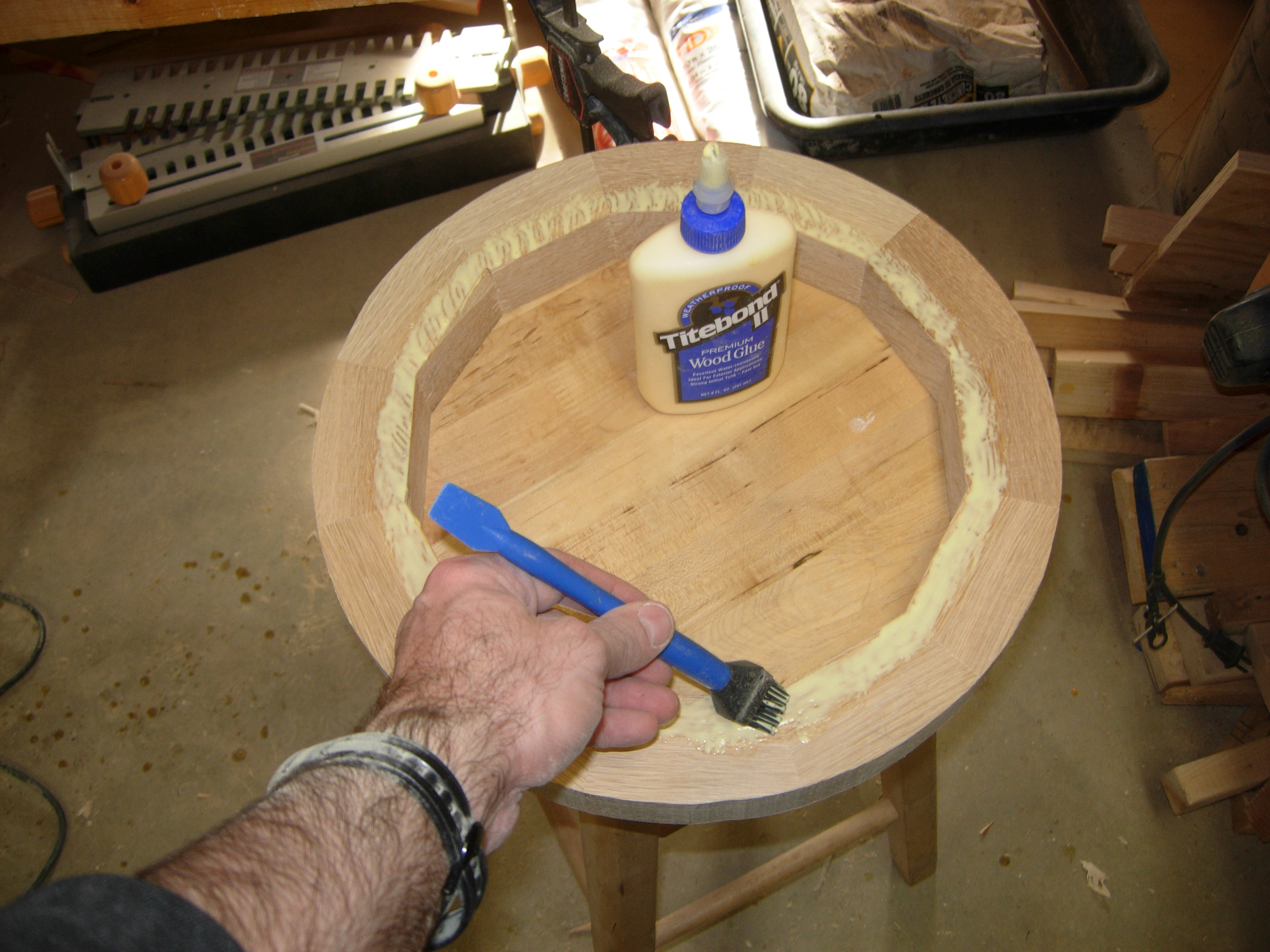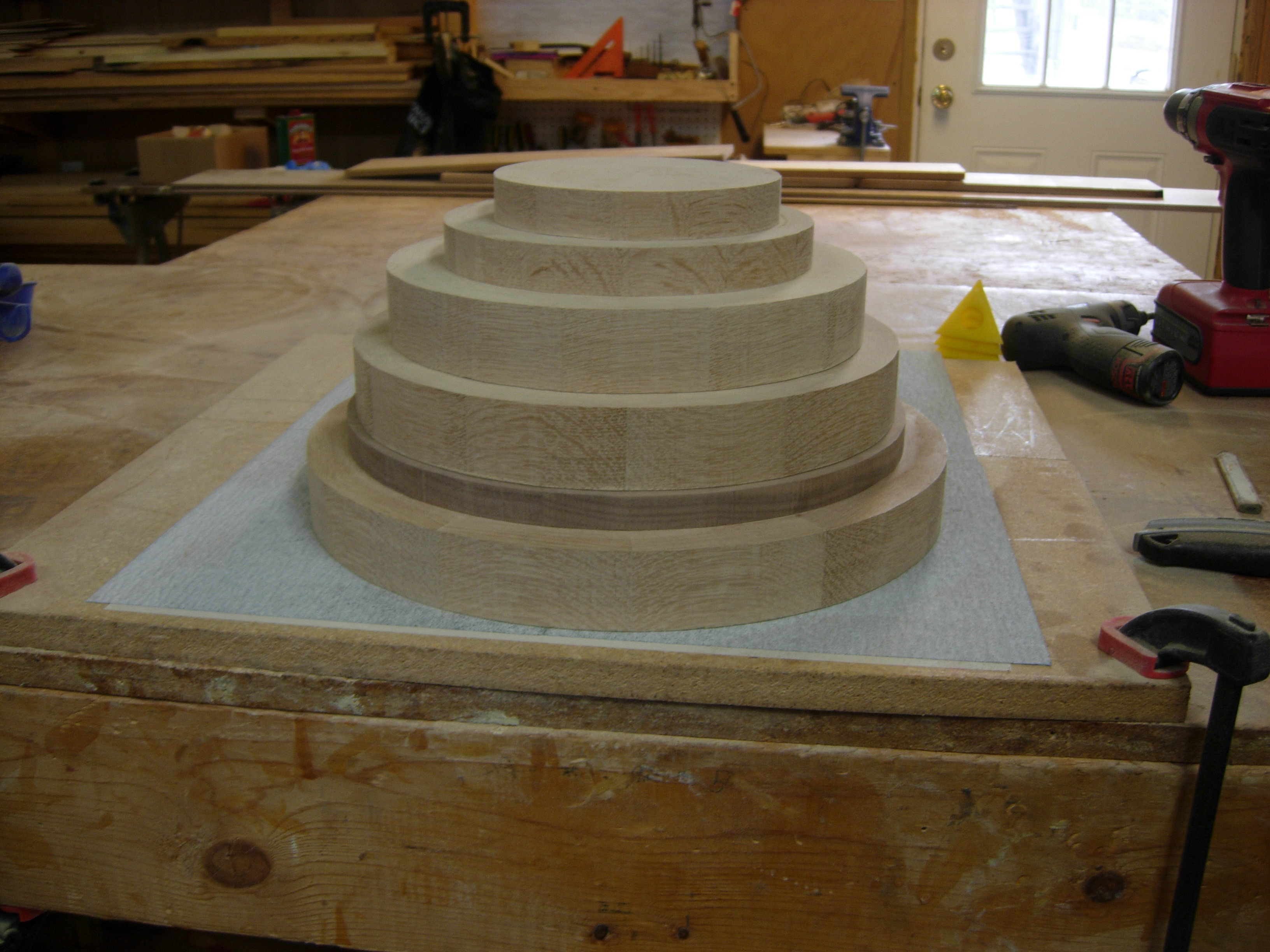 I set the larger, lower three layers on my shop stool and clamped them down to its flat surface, for the glue to dry.