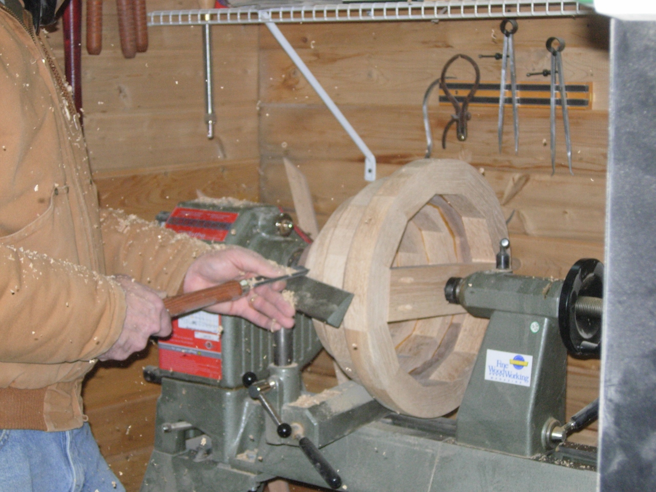 I don’t use my lathe too often, and this is the largest thing that I have tried on it. So I really didn’t know what to expect. I put on my heavy winter coat in case this assembly blew up like the last one that I tried. (A little extra cushion can’t hurt…) I also put on my glasses and face shield.