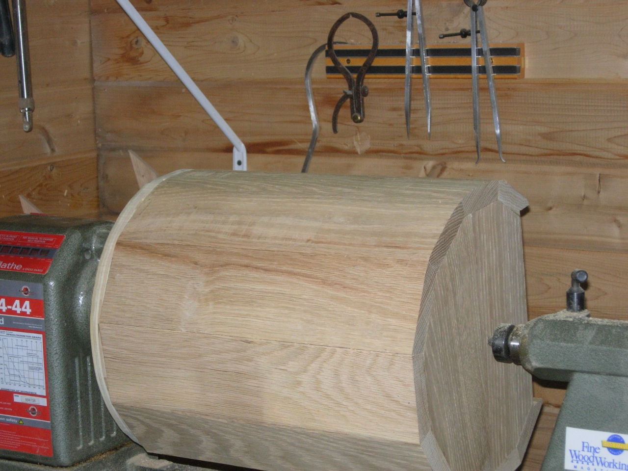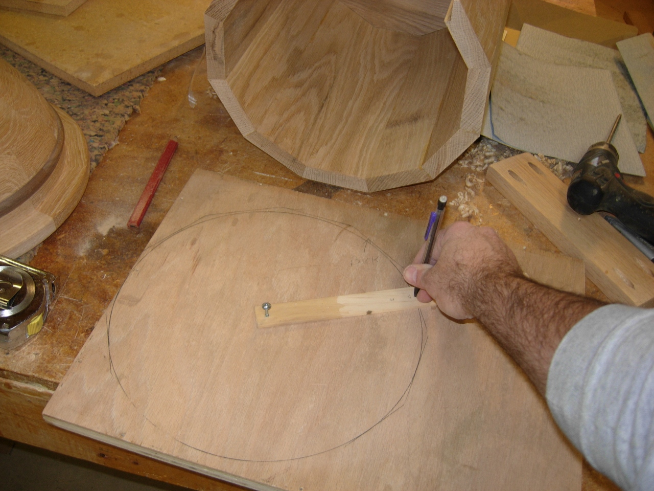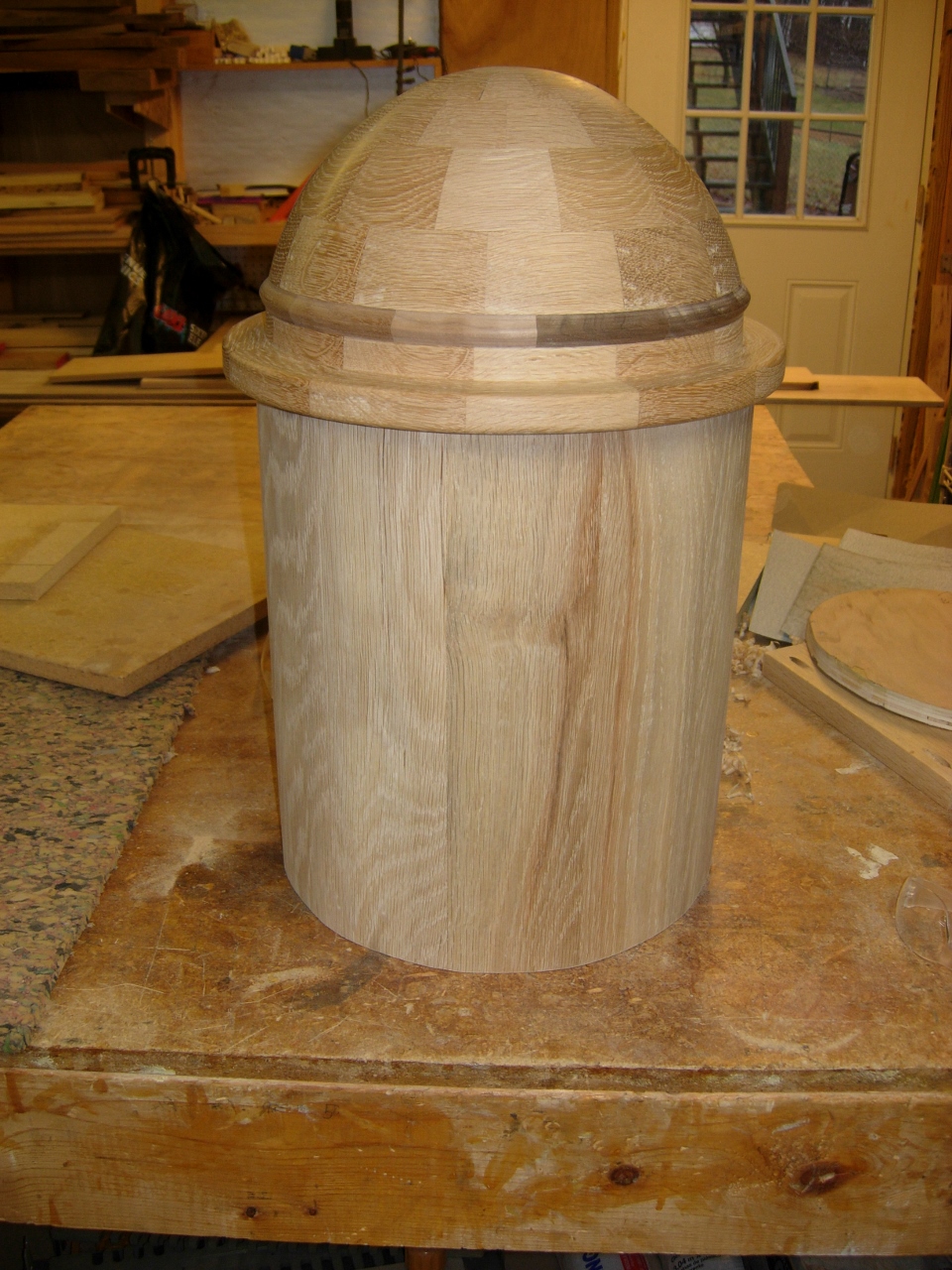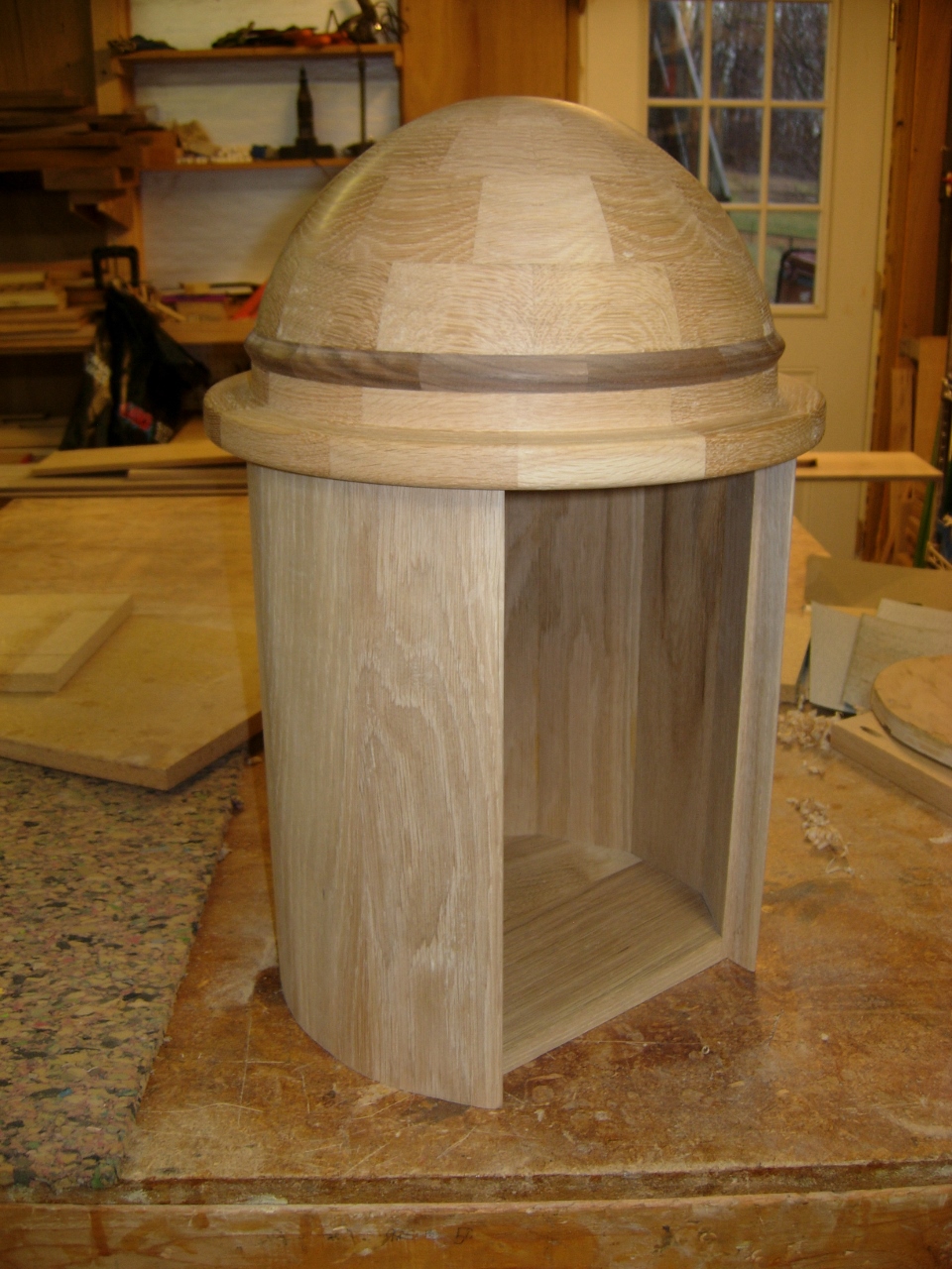 With the dome-shaped and sanded, it is time to round the body of the tabernacle. I started by tracing the top on a piece of plywood and creating a circle that would represent my finished shape. This I attached to the top, in place of the dome, and went over to the lathe to see if I could turn the body. If I could get it centered and mounted well, I intended to build a plug for the doorway and turn the shape.