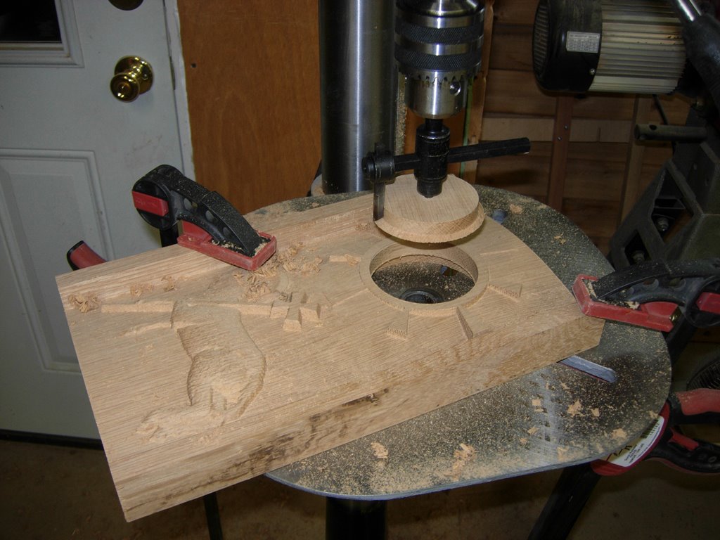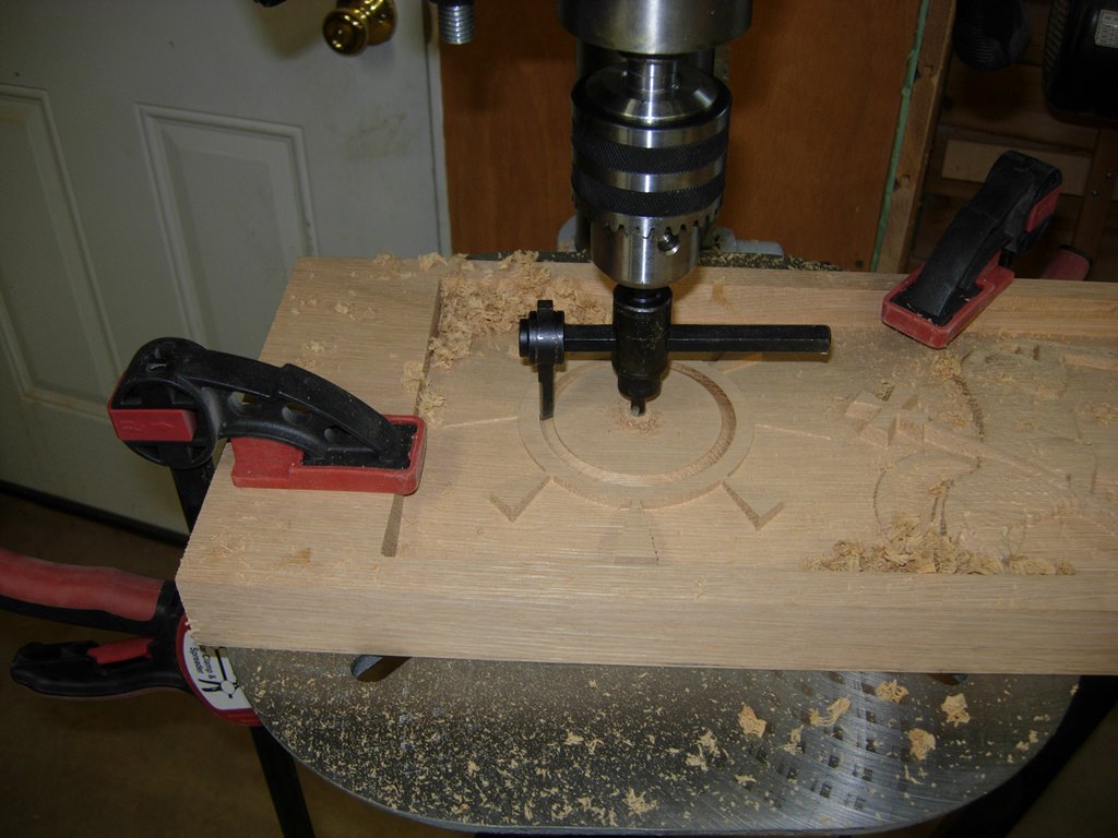 I let the glue dry on the door panel then placed it in the carver and let the program run. In the half hour while that was carving, I moved back to working on the main door panel. The reason I left the panel oversized, and haven’t cut away the outside yet, is that I need a flat surface to mount to the drill press on both faces. Once I drill out the window openings, it will be cut down. Using my hole cutter, I started a cut of a 3″ diameter circle in the center of the 4″ disc on the front of the panel. The main purpose of this was to locate the center pilot hole. I only cut about half way down to the depth that I would need, because I need the pilot hole to stay located for a while.