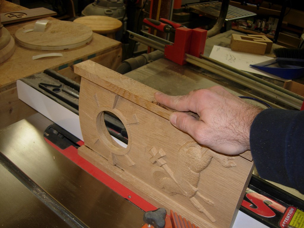 With the little door complete, I moved my attention back to the main door. I used my block plane to shape the curve of the door edges, to better blend the radius of the door panel with the radius of the cabinet body. I then sanded everything down smooth. While I was at it, I sanded down the rays on the side of the circle to match the curve of the door. they were flat before, and I thought they stood out too much.