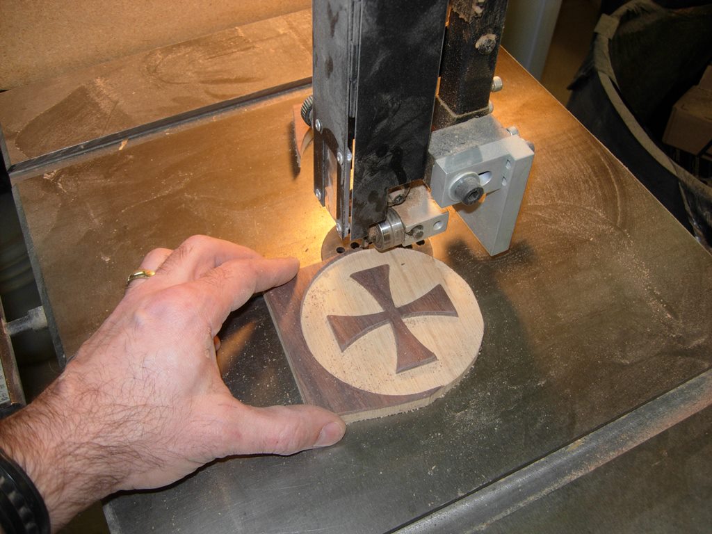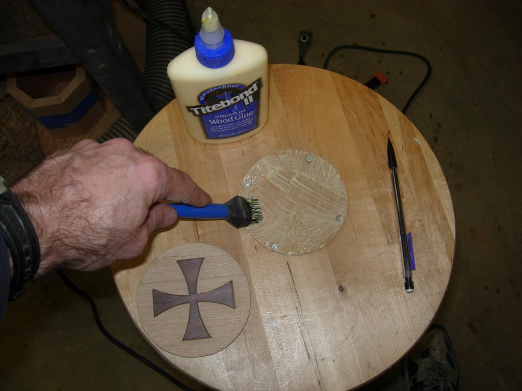 I need a small display window in the door, so I intend to place it in the flat circle that I carved into the front panel. I need a small door to cover the window, but I can’t find a tiny hinge for a round door, that I like. So, my current answer is “rare earth magnets”. I purchased some 1/8″ and 1/4″ diameter magnets to use. I need to embed them in the door and the window frame, close to the surface, so to create the door panel, I am layering a 1/8″ panel up to a 1/4″ panel with double-sided tape. Then I am glueing a 1/8″ piece of walnut to that. The whole assembly comes to 1/2″ thick. That is my minimum thickness for the carver. I created a program for the carver that has a cross to match the altar. The cross will be walnut and the rest of the walnut will be carved away. This layer-up should make more sense as I get further into yesterdays build.