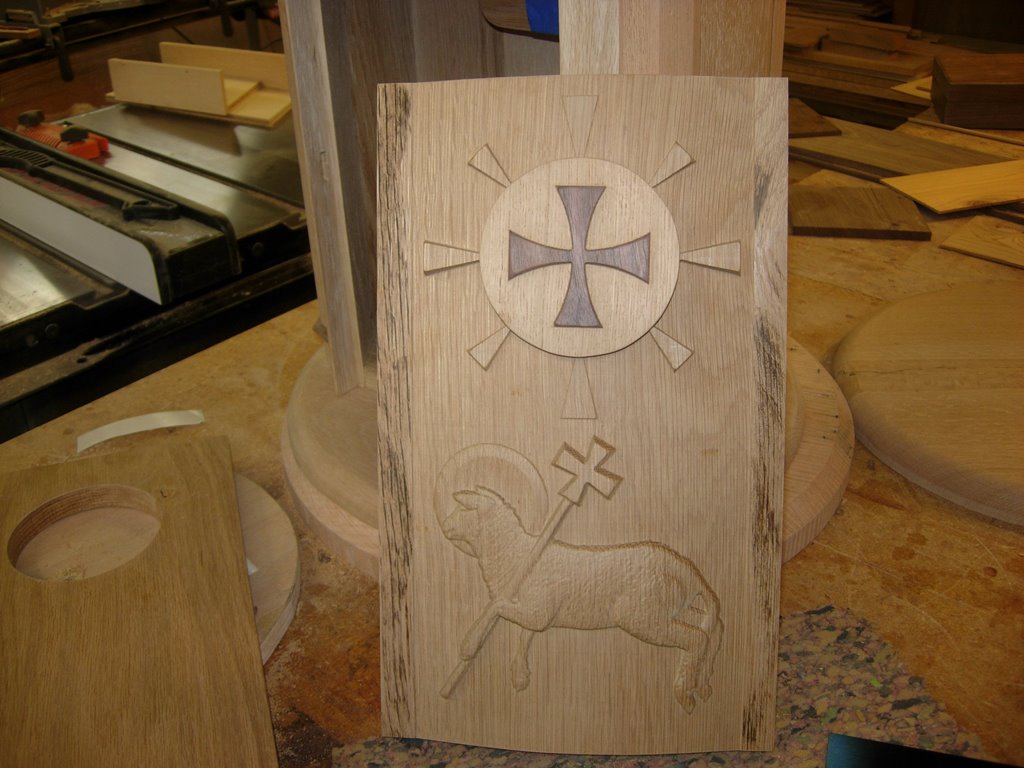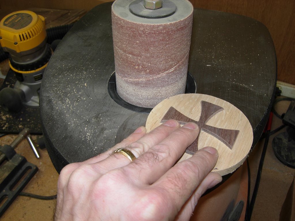 I attached my buff sanding wheel to my drill and cleaned up both of the carved panels.