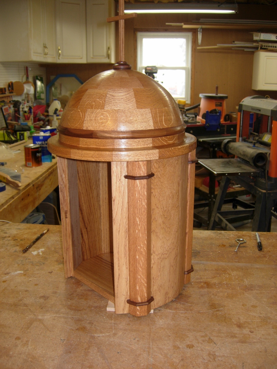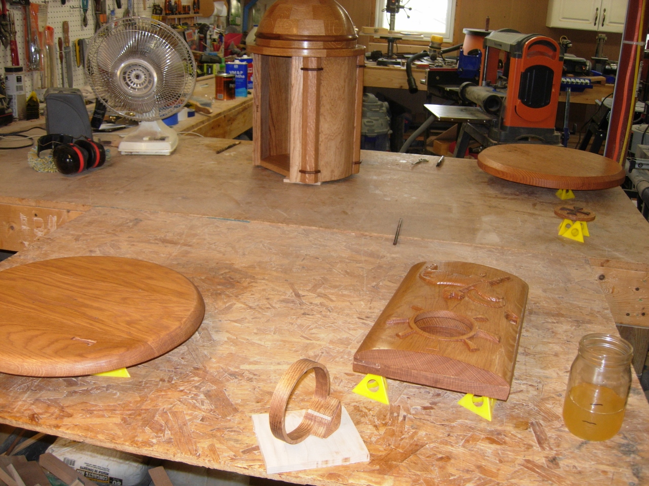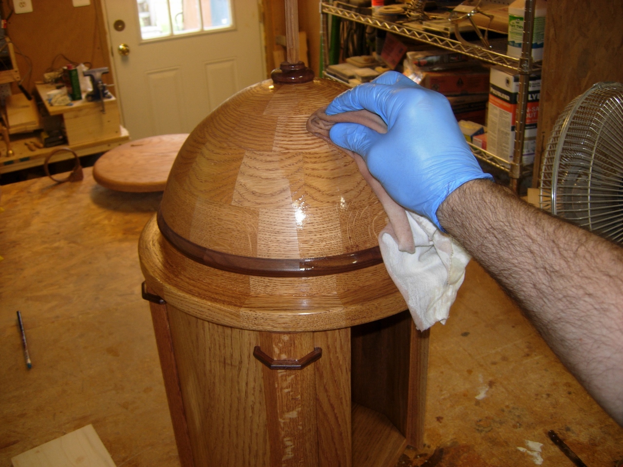Well, the stain has had about 12 hours to dry, and the can says a minimum of 8, so I should be good to start applying the finish. All of the other furniture at Saint Peter’s has a polyurethane finish, so this cabinet will get the same. There will be several problems with applying a poly finish to this piece. Poly is a film finish, meaning that it builds up a film that gets thicker the more layers that you apply. Since I have a few tight-fitting pieces, like the retainer ring for the window and the doors, that wouldn’t be acceptable. I also have a lot of nooks and crannies to get finish into as well. That usually means blobbing a fair bit of finish onto an area and letting it flow into the tight spots, unfortunately that will also cause runs. So to get a poly finish I am going to make up a wiping poly. It is a very easy finish to make, you simply mix polyurethane and thinner. I prefer Naphtha to lacquer thinner because it is more refined and the fumes are not nearly as nasty. I want a thin finish, so I mix them 50/50. If you want thicker, you just mix in less thinner.