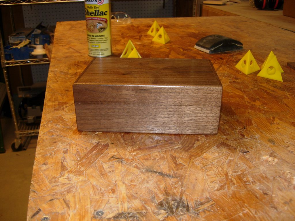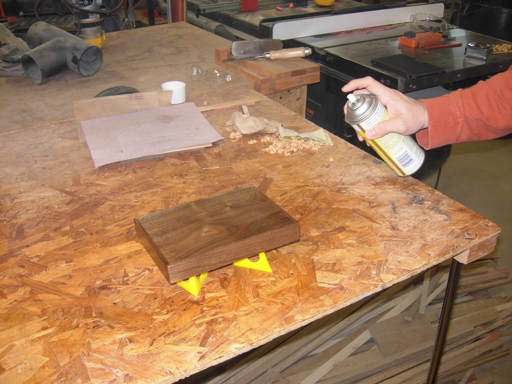 We also started applying the finish to the walnut box. We decided to use shellac because of the quick drying time. We covered the cedar, lining the top, with painter’s tape before spraying. Since you can apply successive coats after only 15-20 minutes of drying, we did manage to get about four coats applied.