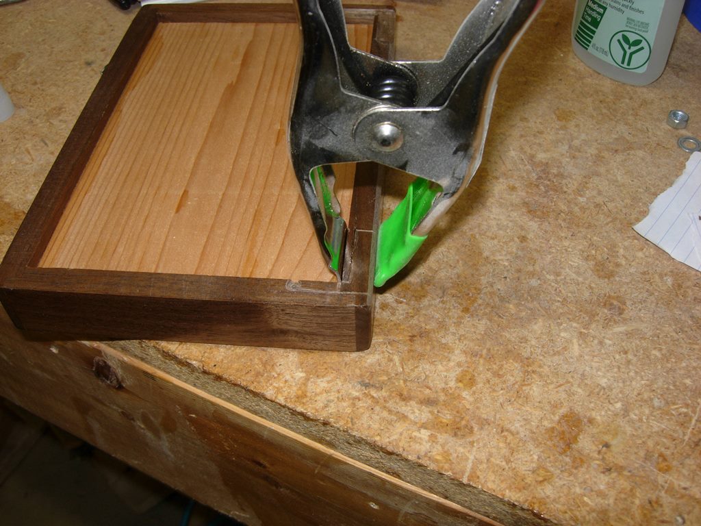 I cut a couple of pieces of left-over cedar to press-fit into place, to clamp the cedar to the sides while it dries.