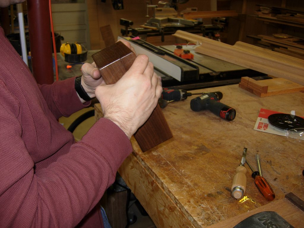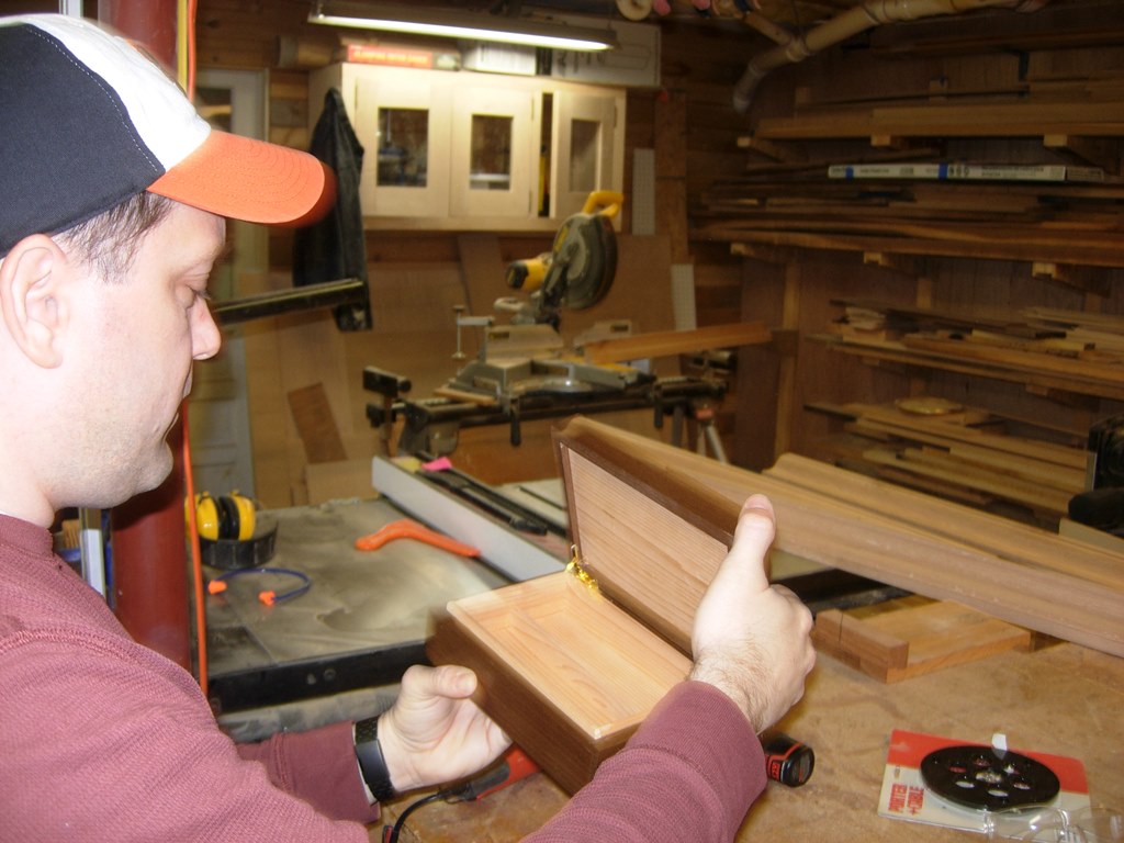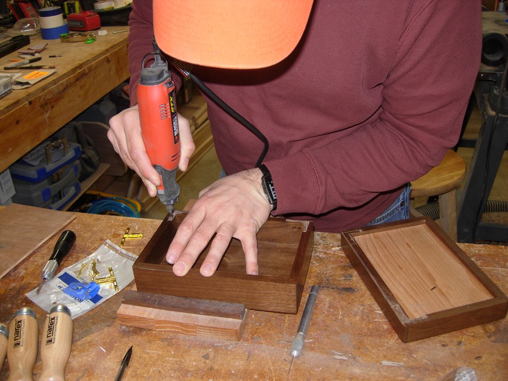 Things started out a little rough when Rob applied a bit too much pressure while cutting the hinge mortise, on the lid, and a thin piece split away.