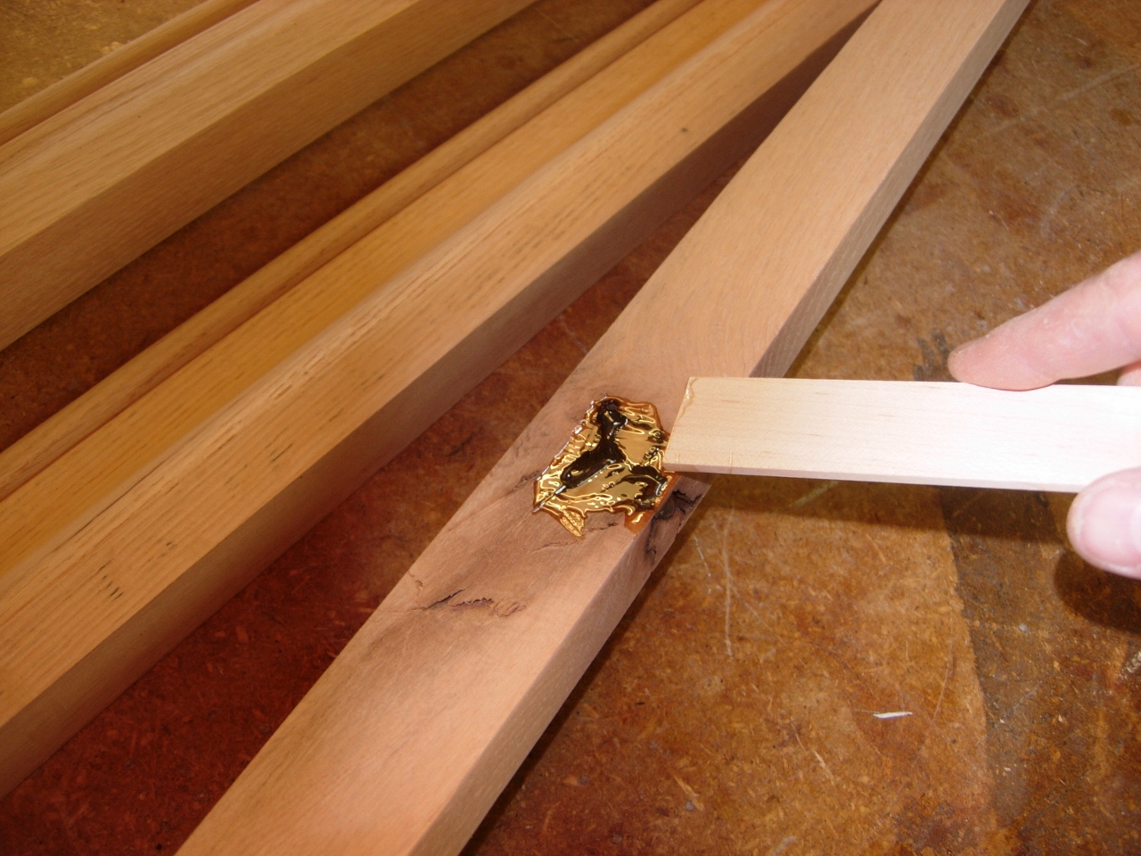 With the knot repaired, I moved on to attaching the pieces at their miters. I sanded the cut ends down with 400 grit paper to get them as smooth as possible, for glueing. I applied glue to both sides of the miter, rubbing it into the porous ends with my finger.
