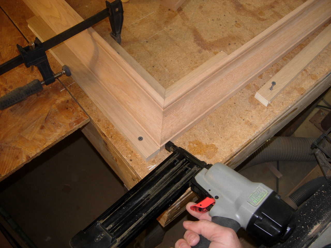 I attached a few cleats to my work bench to aid in holding the trim square, then attached the trim with two 2″ brad nails each. I wanted to avoid nailing the corners, but I couldn’t find a better way to hold them while they were drying.