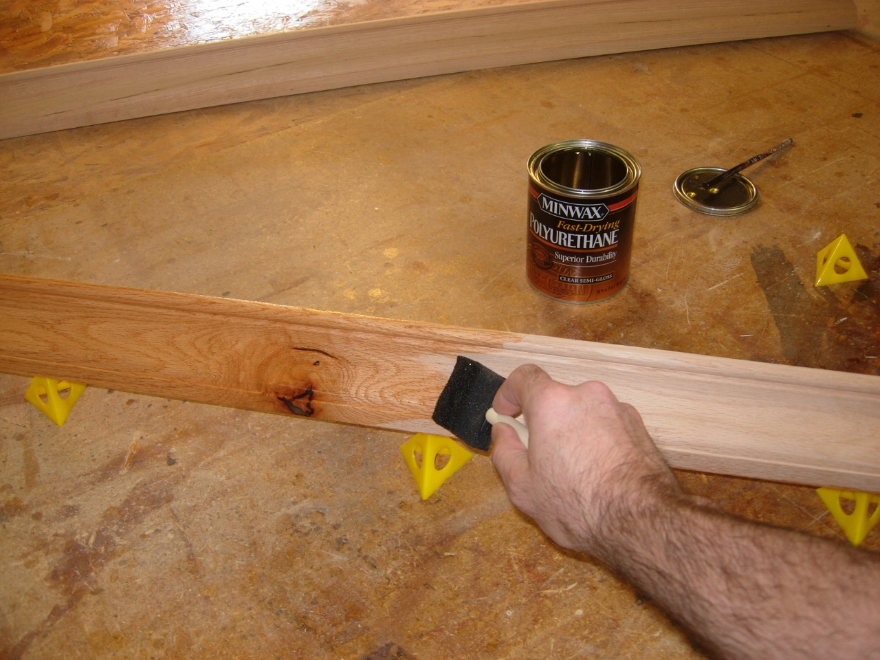 I applied the first coat of polyurethane with a foam brush, to get into the tight parts on the profile. The sanding marks in the epoxied knot, completely disappear when the poly is applied. I will steel wool the surface and apply a second coat tomorrow. Hopefully these two pieces will get installed later this week.
