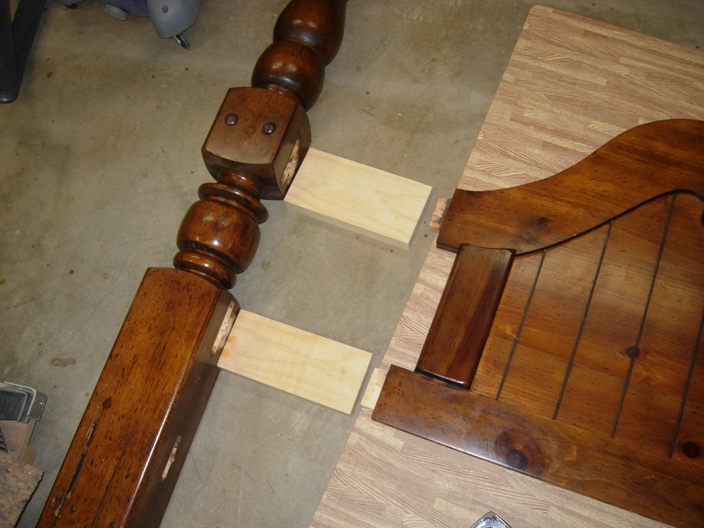 After removing the blocks and screws from both sides, the footboard separated easily from the posts. I don’t know what king of glue was originally used in the assembly, but it no longer held anything together.