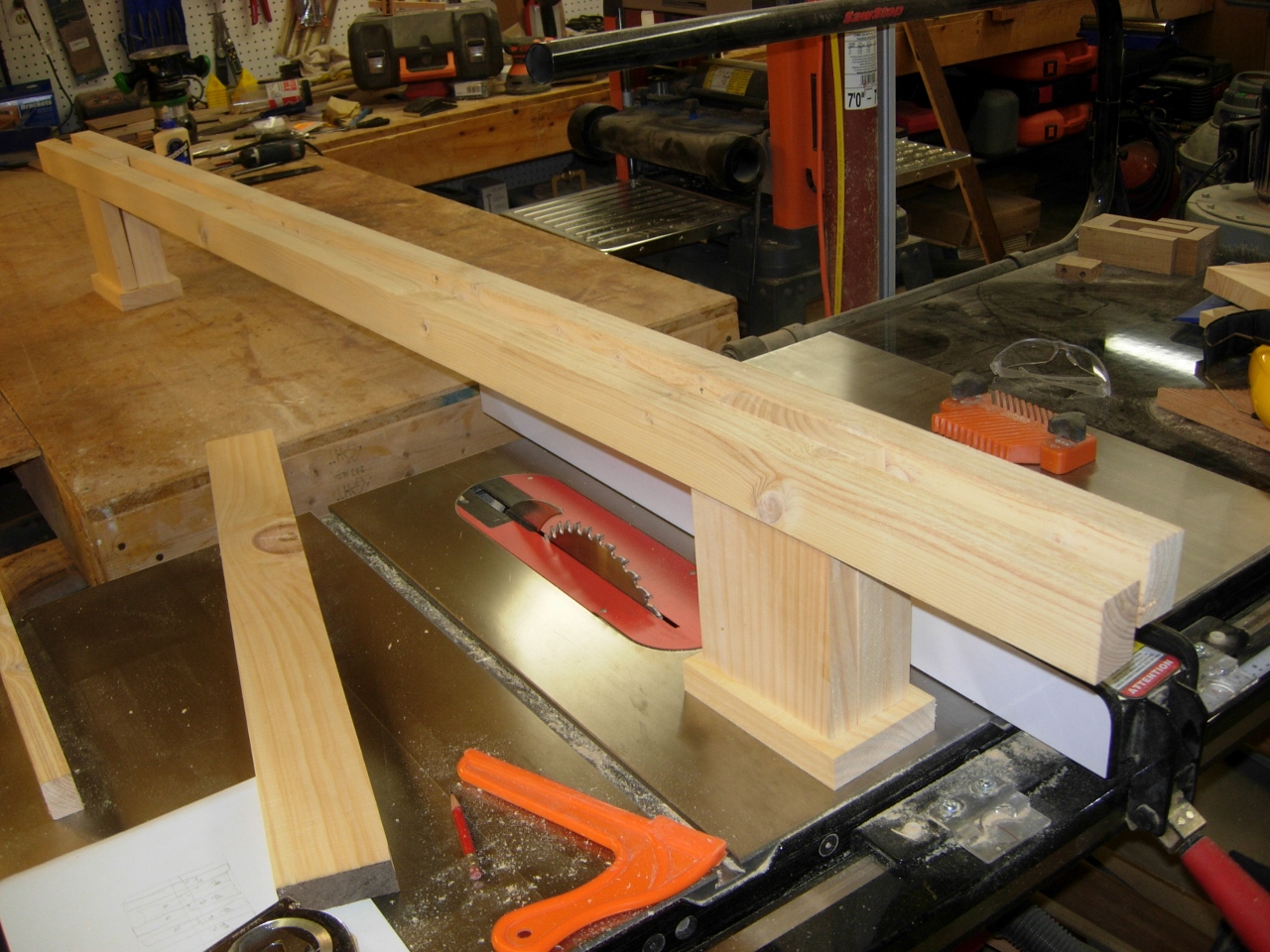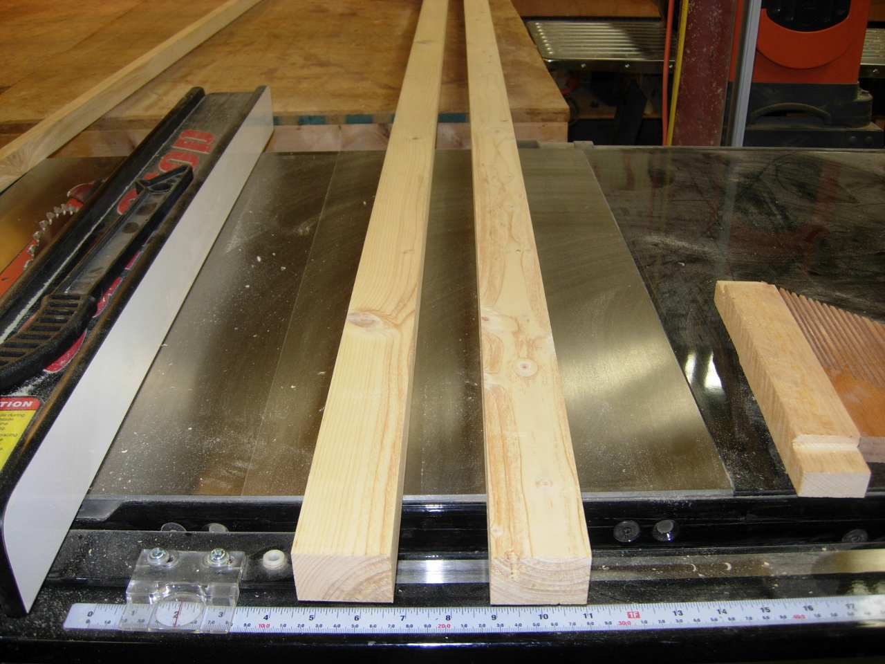 I have exhausted most of my supply of pine boards, just a few short pieces left. For the long rails, that will run down the center, I decided to use one of the 2″x6″ boards that was formerly used to support my workbench. It is at least 10 years old, so I think it is dry enough that it won’t twist on me. I ran it through the thickness planer to clean up the surface, then ripped it into 2″ wide strips.