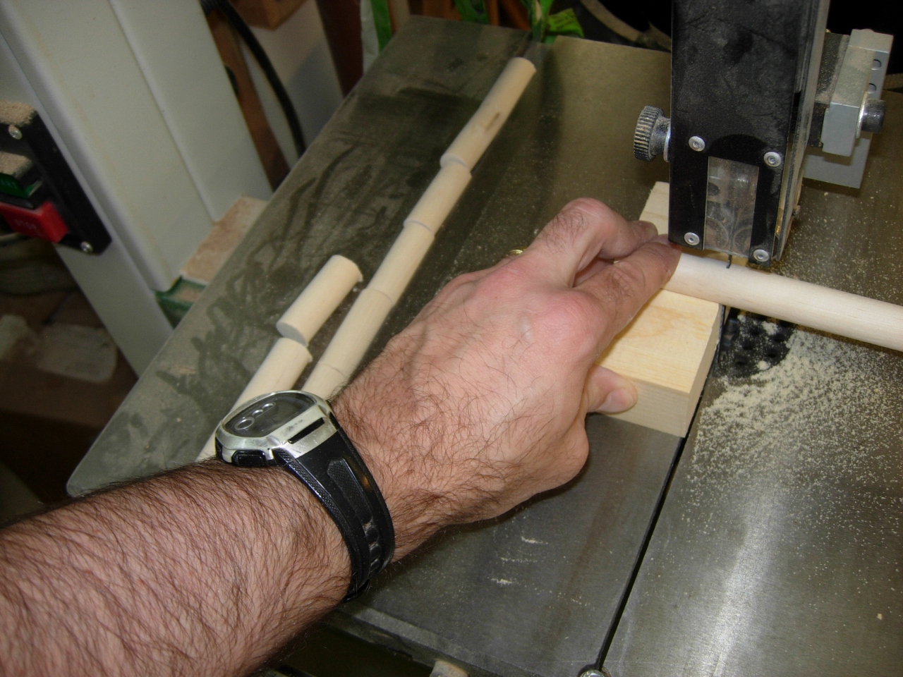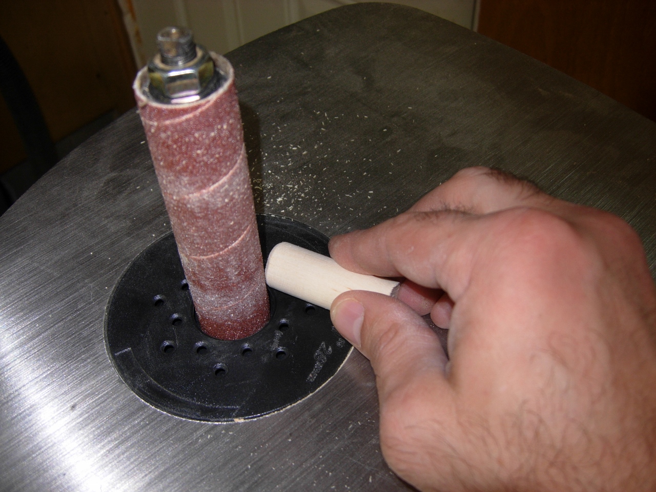 I cut 18 more dowel pegs, using my “V” block jig, then sanded a bevel on one end.
