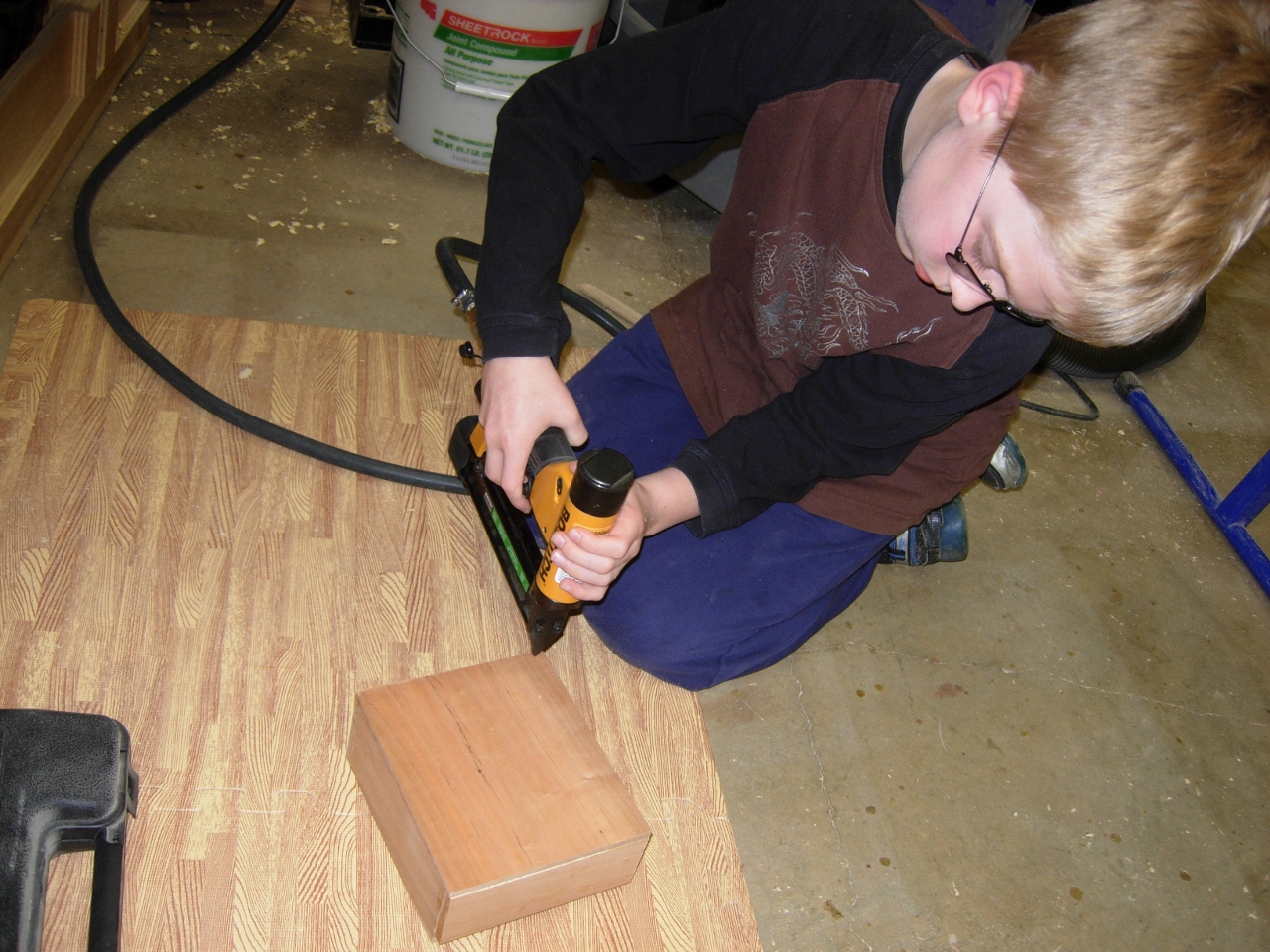 We did a dry-fit of the pieces and everything looked good so we applied glue to the edges and Adam pin nailed the sides and bottom together.