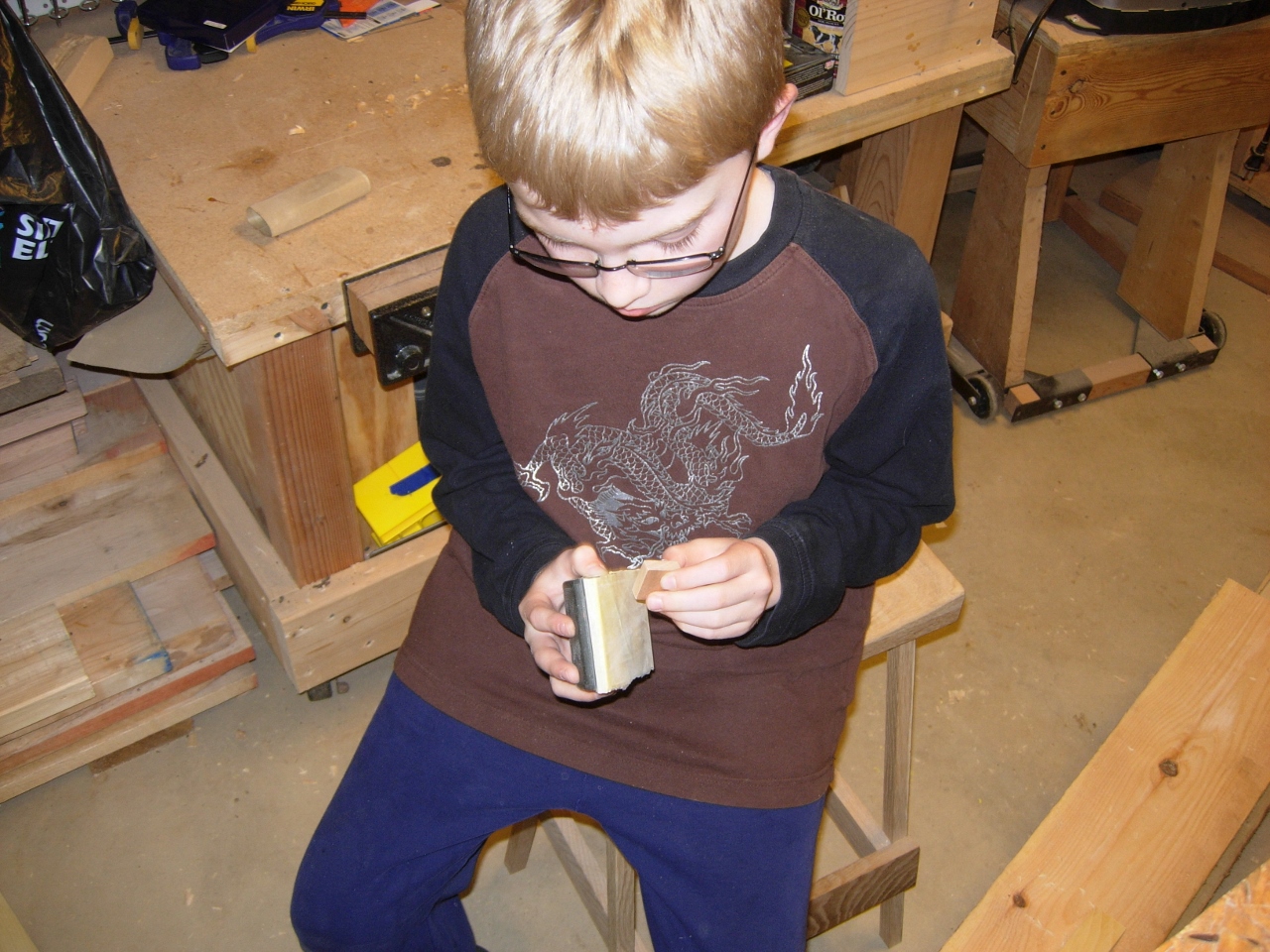 My dear wife’s birthday is today. Adam came to me last weekend and asked if he could make Mommy a jewelry box for her birthday. I asked him to pick out a design from a book that I have on building wood boxes. He picked out a sliding top candle stick box. He decided that it fell into his skill level, so he grabbed some pine and his hand saw, and started cutting. I was working on the bed frame at the time, so I let him work for a while. After he had a majority of the pieces cut, I helped him cut the grooves for the lid and the rabbet on the lid’s edge. He wasn’t happy with the appearance of the scrap pine, but he was very happy that the box was functional. He even hand carved the finger pull in the lid. We decided that this box made an excellent prototype, but we would make mom’s box from something harder and a little nicer looking. The pine box will probably wind up holding some of his tools and sharpening stones.