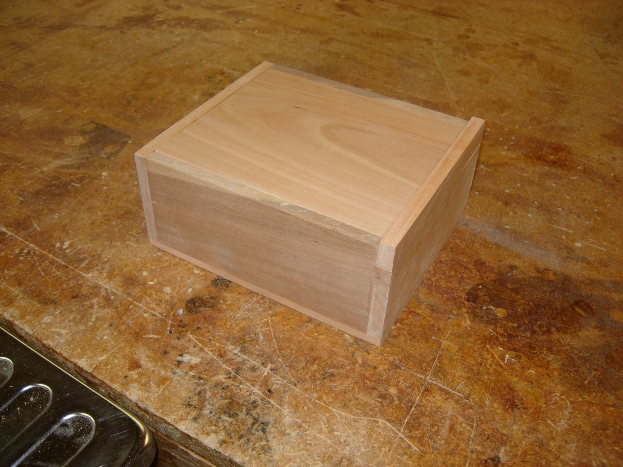Instead of trying to carve a pull, we made the front side taller, then cut a 1/2″ piece off to glue to the edge of the lid.