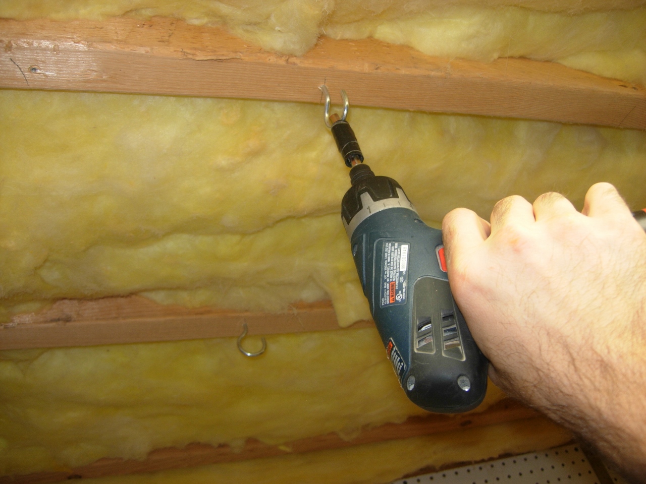 Installation was easy. Basically I needed to mount four hooks to hang four chains, that hook to the top of the unit. I cheated with the hook installation. I used a Drill adaptor, used for installing eye lag screws for a drop ceiling. It is basically a split tube with a sliding sleeve around the outside. I just set the hook in the slot, lining the threads up with the center of the adaptor, and screwed the hook right into the floor joists, above.