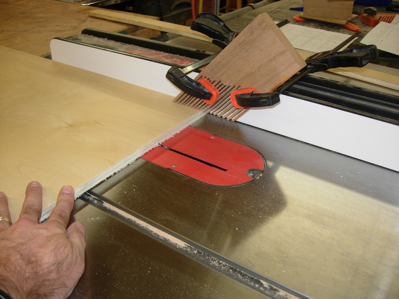 Some of my plywood is a bowing a bit, so I clamped a shop-made feather board to my fence, to hold the plywood as flat as possible to the table.