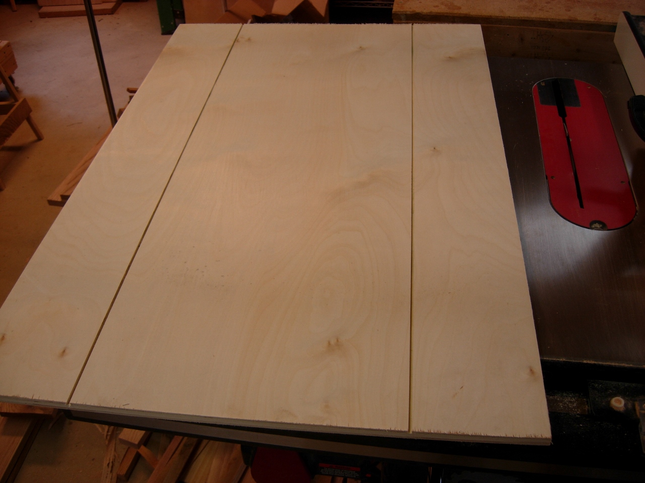 I set the fence 5″ off the blade and ran my plywood sheets down both sides.