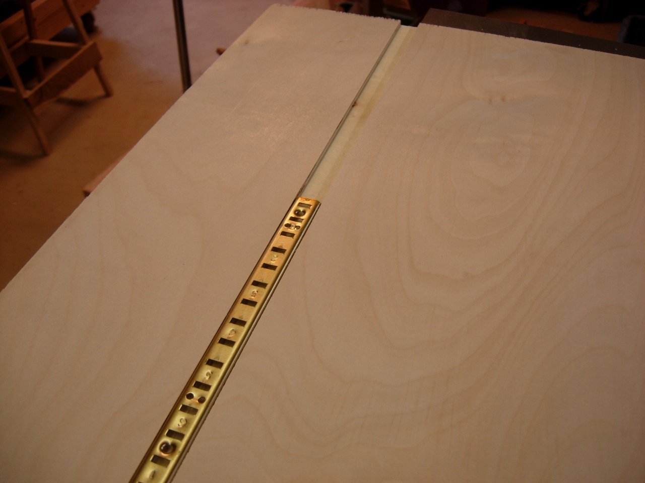 I did manage to grab a couple of hours to work in the shop today, so I worked on cutting grooves for installing the adjustable shelf standards. For the last couple of cabinet projects, I cut the dados with a router. I wanted to try something a little less messy, so I am cutting them on the table saw today. To start, I set the blade depth to match the thickness of one of the shelf standards.