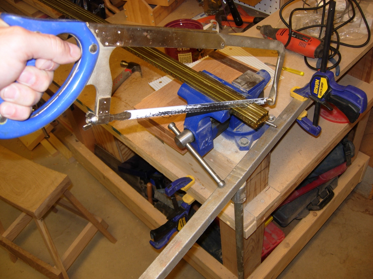 The shelf standards are sold 36″ long and my cabinets are 2′-11″ tall, so I had to cut the standards down a bit. To save time, I stacked them together and clamped them up in a vise, marked 1-1/4″ in, and started cutting..