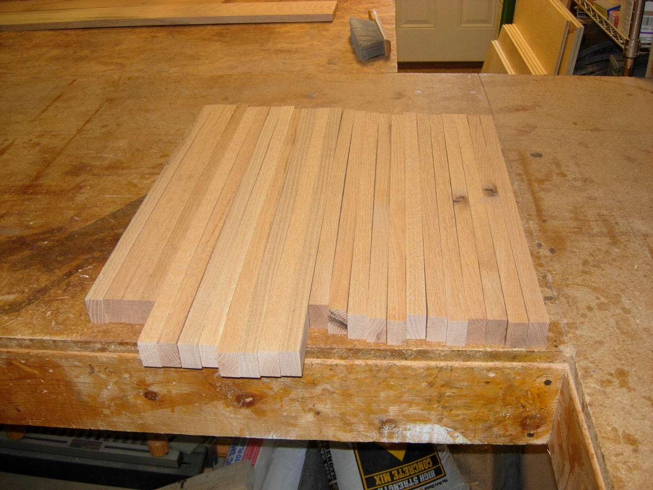 To create the frame, I rip a pile of 1-1/2″ wide strips from some 3/4″ thick oak that I have. I figure up the lengths based on the dimensions of the inner plywood shell of the cabinet, and cut each strip to the desired lengths.